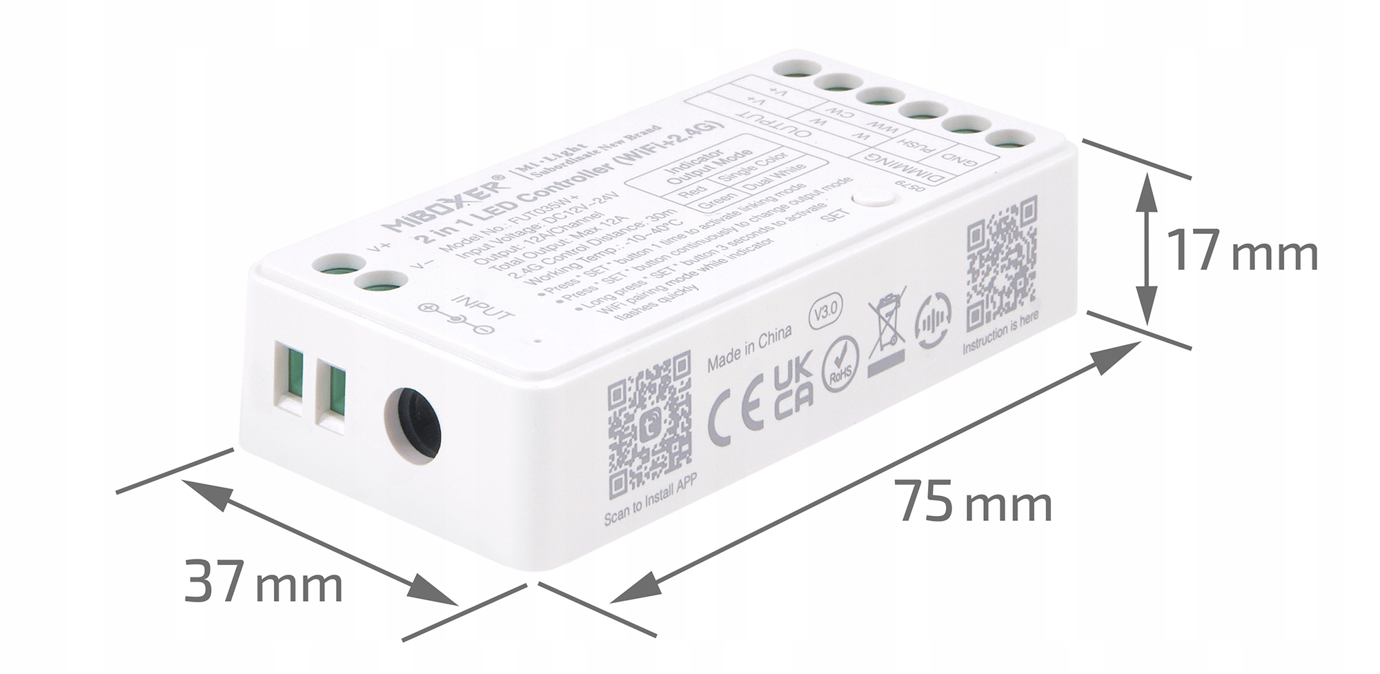 - компактные размеры:благодаря небольшим размерам (75 х 37 х 17 мм), контроллер можно установить даже в труднодоступных местах, например, потолочные ниши, шкафы или светодиодные профили. Минималистичная форма означает, что устройство не оказывает негативного влияния на эстетику установки.