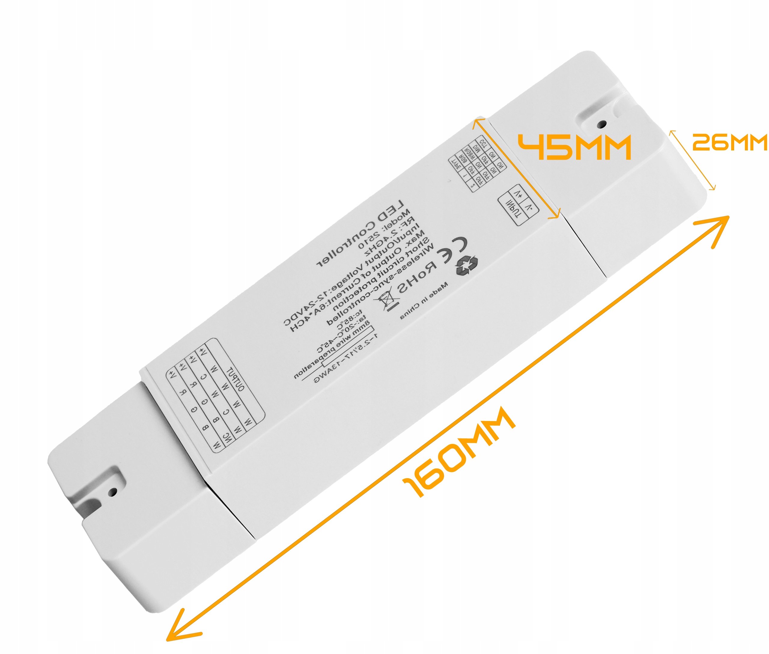 - Подключения: Клеммная колодка для источника питания постоянного тока и 5/6-проводной выход для светодиодов с общим анодом V+ и каналами R, G, B, W / RGB+CW+WW.