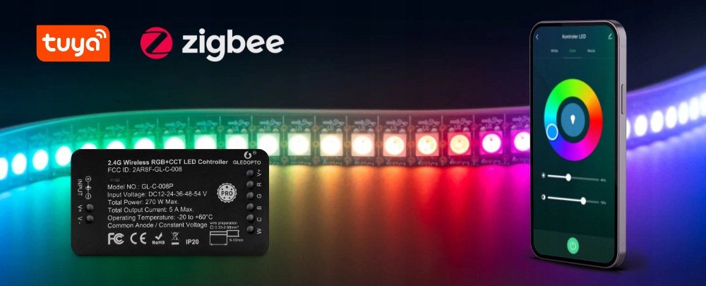 Контроллер позволяет управлять лентами RGB и CCT, подключаться к сети Wi-Fi через протокол Zigbee, а поддержка приложения TUYA позволяет включать светодиодное освещение в сценарии интеллектуальной домашней автоматизации h2>