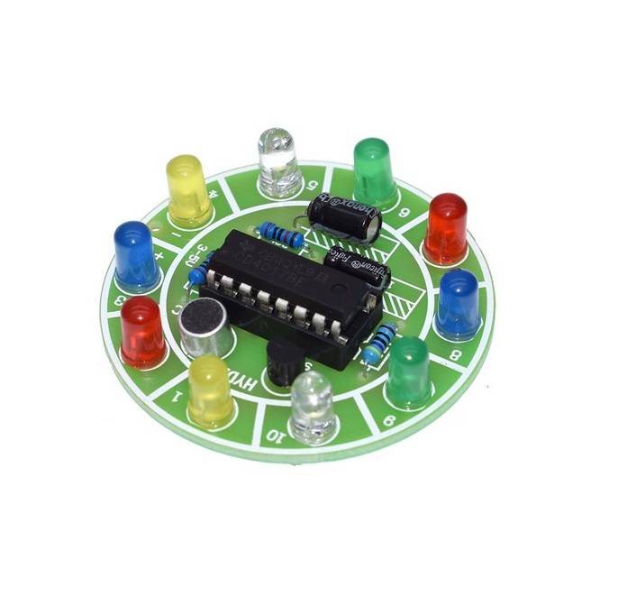 Микрофон преобразует звуковой сигнал в электрический сигнал, который, усиливаясь транзисторами и счетчиком, возбуждает светодиоды.