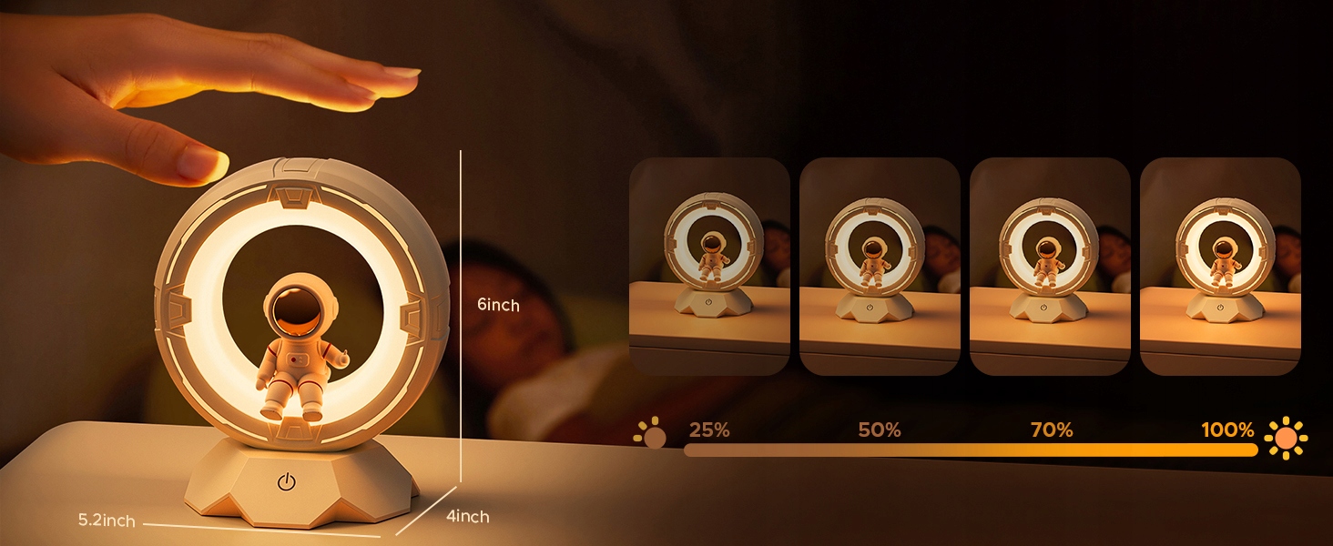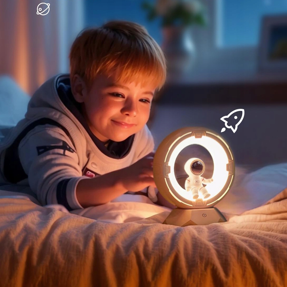 Этот очаровательный прикроватный космонавт с очаровательной и причудливой внешностью, легко привлекает внимание детей и сопровождает детей во сне, не опасаясь тьмы. ночь. Ночная лампа для детей изготовлена из высококачественного пресса и материалов для ПК, обеспечивающих безопасность использования детьми.
