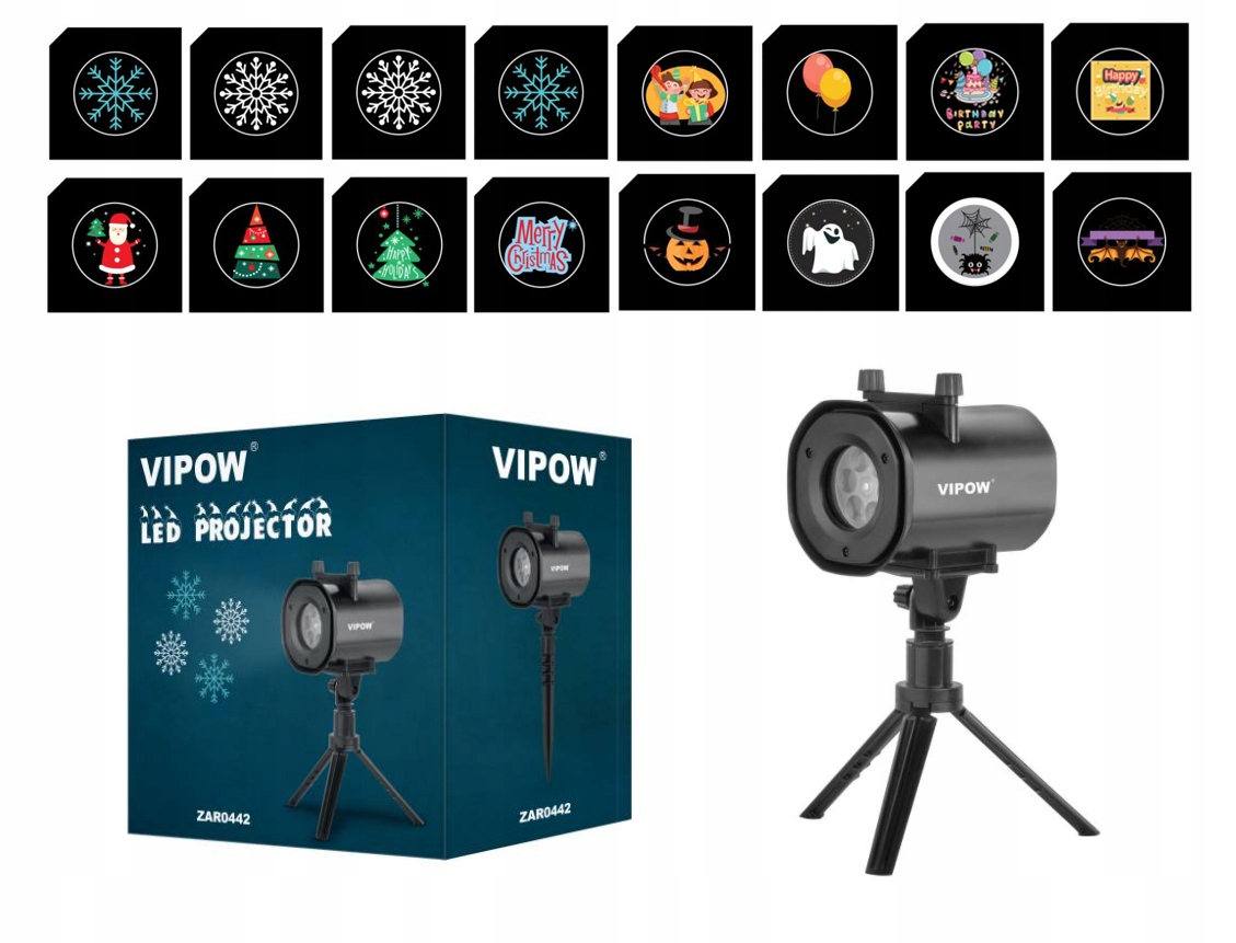 Светодиодный проектор VIPow — устройство, которое придаст вашему дому праздничную атмосферу. В нем четыре слайда, которые вы можете менять в зависимости от случая. У вас есть версия для дня рождения, версия для Хэллоуина и две рождественские версии. Проектор подходит как для внутреннего, так и для наружного использования. Благодаря двум типам основания он всегда будет устойчив – шип легко втыкается в землю, а штатив идеально подходит для использования в помещении. Кроме того, небольшой размер и вес проектора облегчают его перемещение. Устройство светит на расстоянии 10 метров, на максимальной площади 56 м², поэтому освещение даже большого дома не составит проблемы.Источник света: 4x светодиода