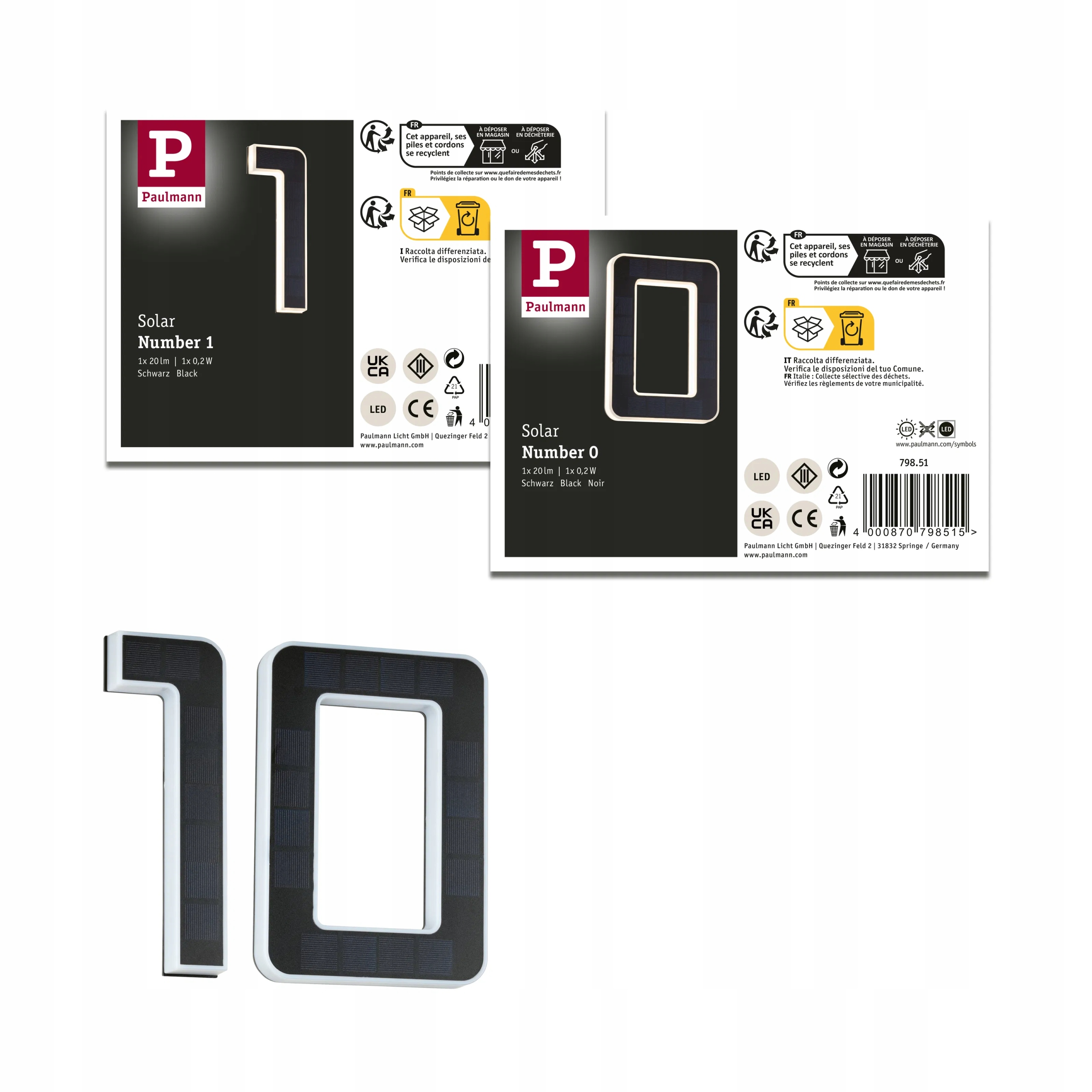 PAULMANN Solar LED для номера дома как декоративное и практичное решение – идеально подходит для оформления фасадов без доступа к электропитанию. В комплект входят две цифры «1» и «0» со встроенной солнечной панелью, работающей автономно и экологически безопасной.
