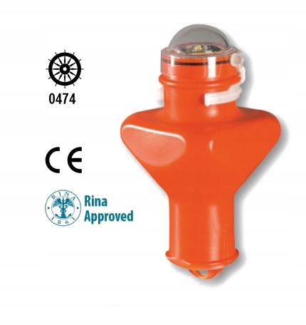 Самовключающийся световой буй из ПВХ оранжевого цвета. Электрические соединения внутри буя выполнены из нержавеющей стали.