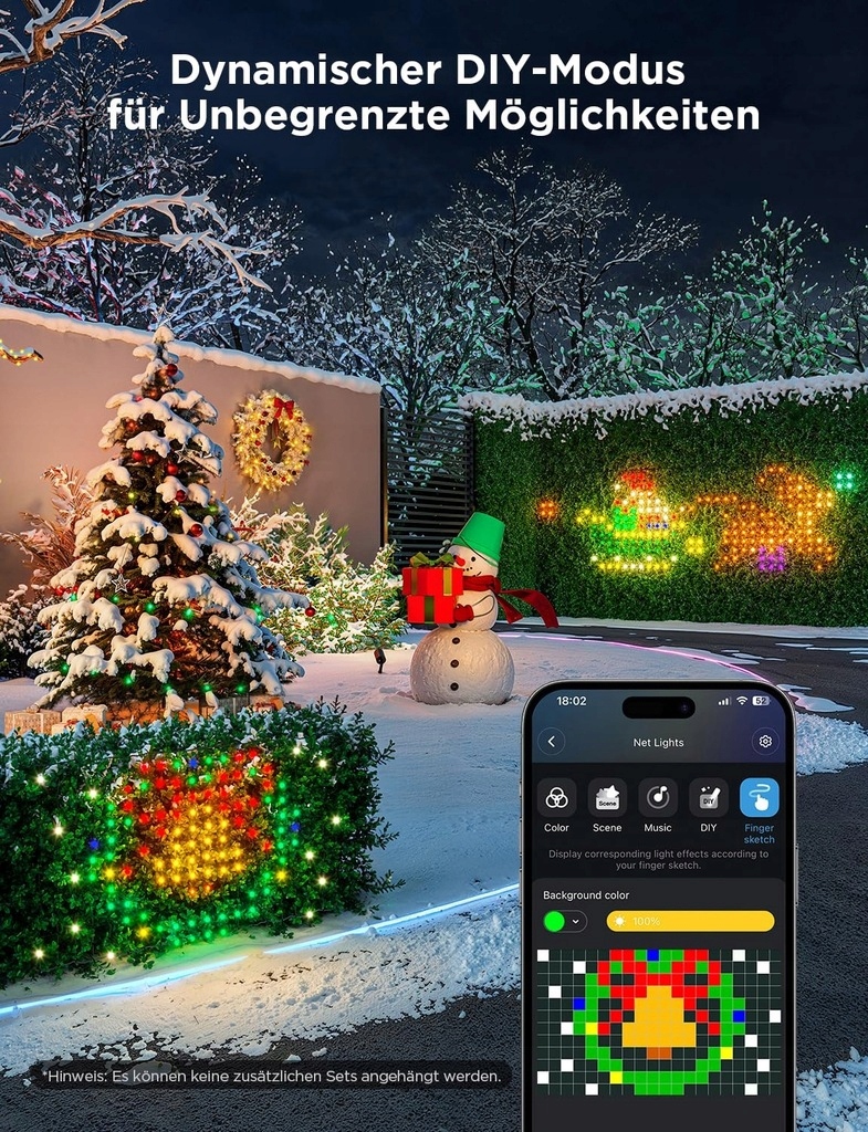 - Creative DIY Режим: Govee Lighting Mesh содержит 64 подарочных мотива, которые легко осветят ваш сад. Вы также можете отправлять GIF -изображения и файлы для быстрого создания анимированных украшений высокой плотности (всего 7 см между бусинками), что обеспечивает лучший эффект.