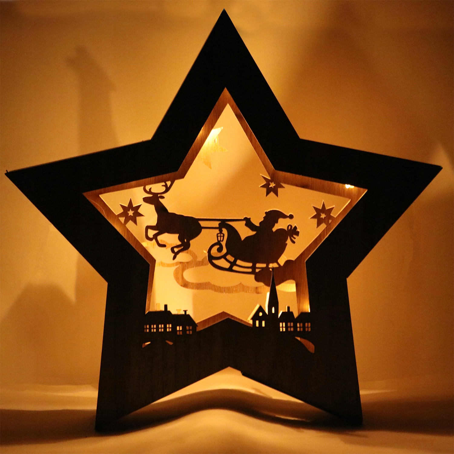 Деревянная звезда с изображением Санта-Клауса и саней — идеальное рождественское украшение, которое можно разместить как под елкой, так и как отдельное украшение.