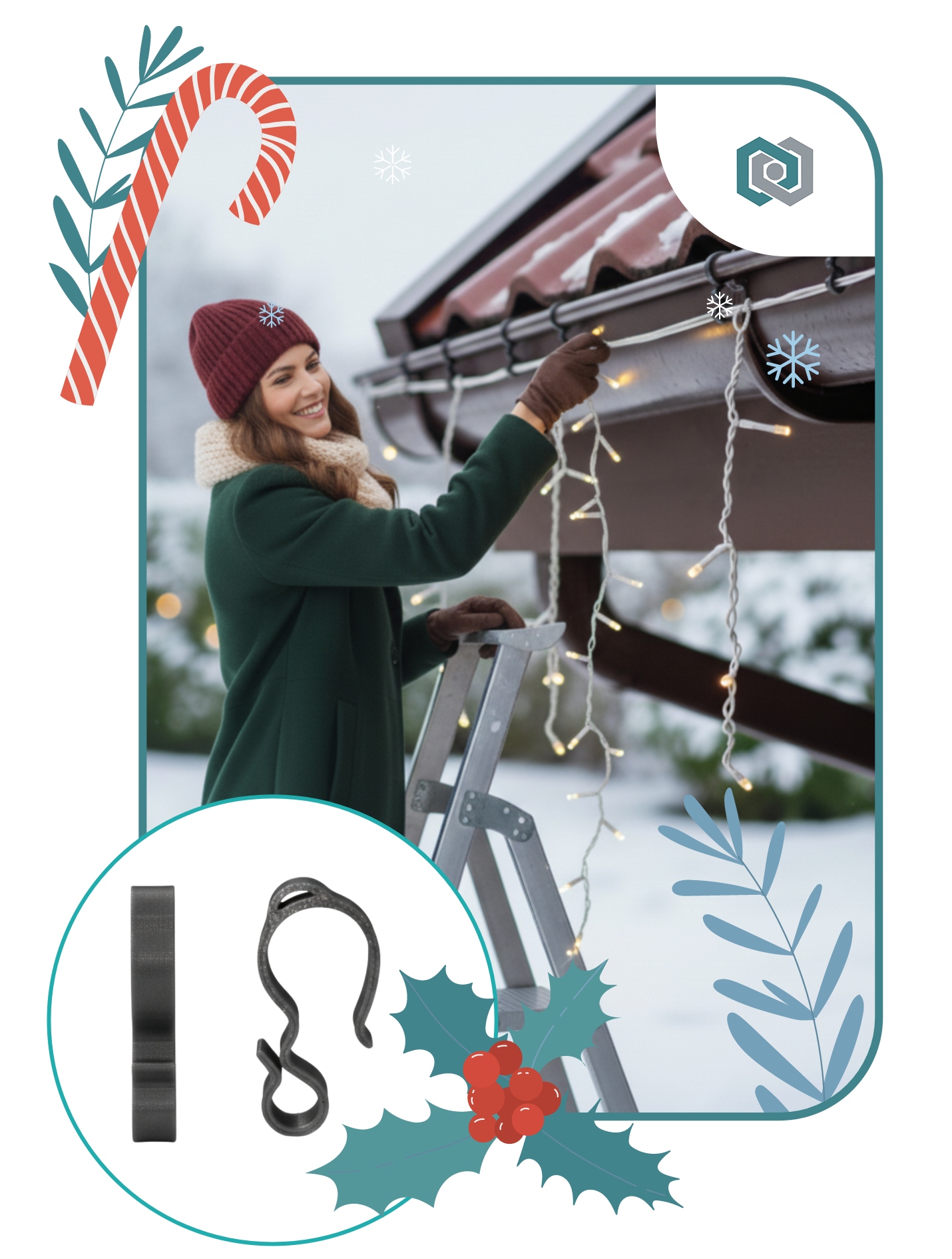 Откройте для себя наши великолепные крючки для желобов для гирляндных светильников! Теперь вы можете безопасно повесить рождественские украшения на желоба или крышу.