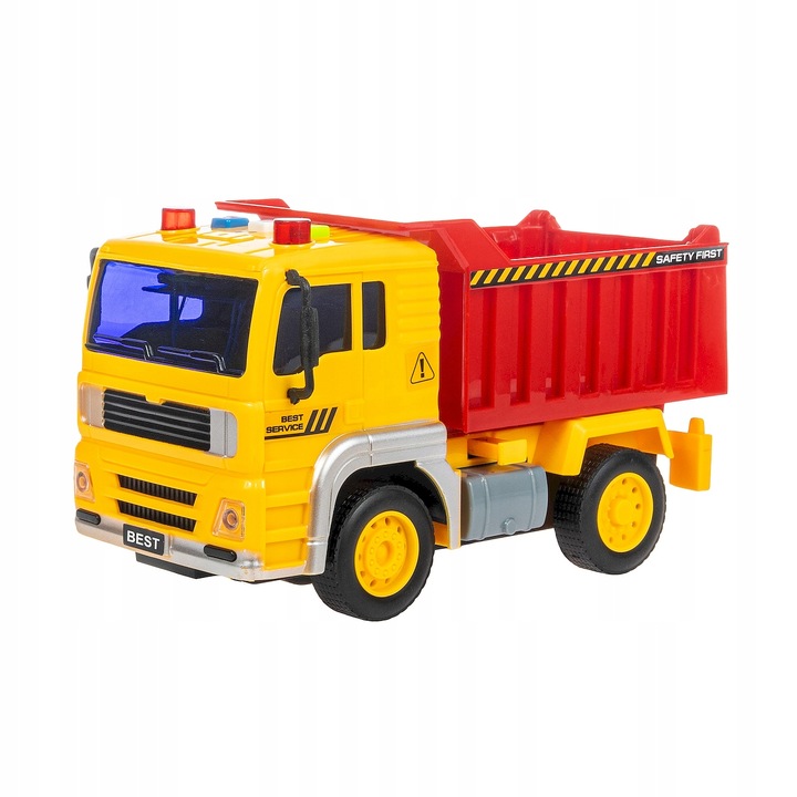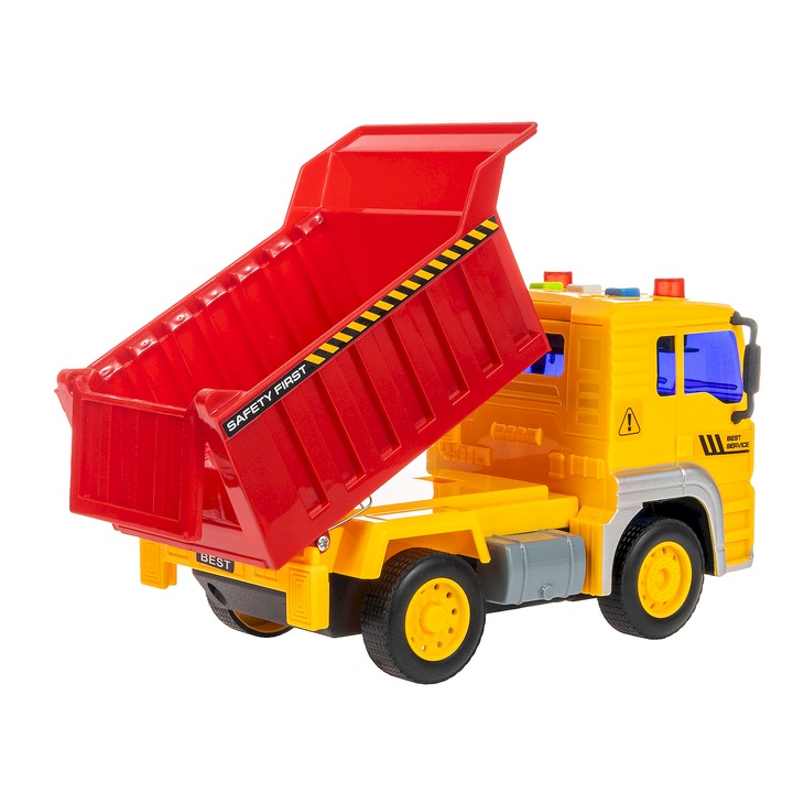 Имеет подвижный грузовой кузов. Кнопка включает звуки и световые элементы.