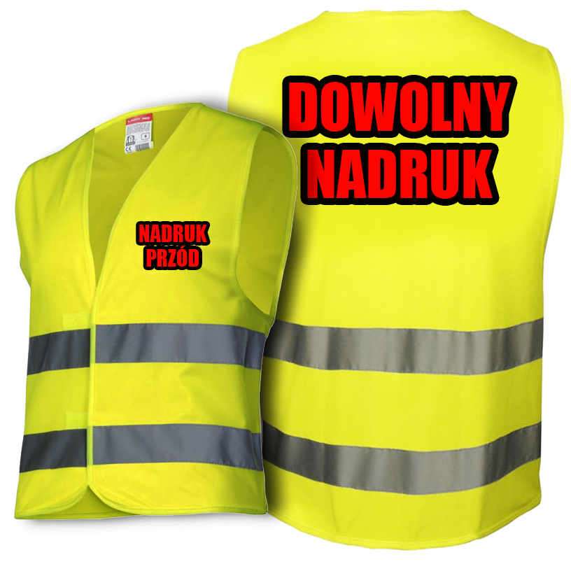 На жилете мы можем разместить логотип, текст, графику - единственное, что нужно учитывать, это то, что цвет принта может меняться на желтой/цветущей основе (синий - намного темнее, может казаться зеленым, желтый может и не так выделяться, серый выходит оттенками коричневого) - такие отпечатки выполняются исключительно на риск покупателя
