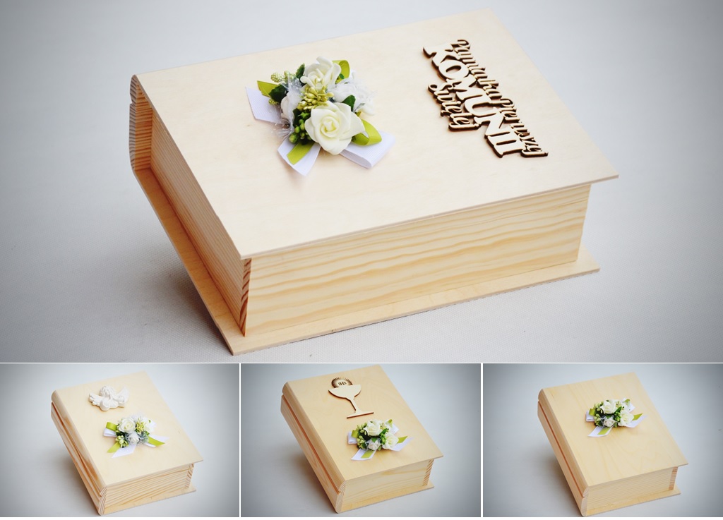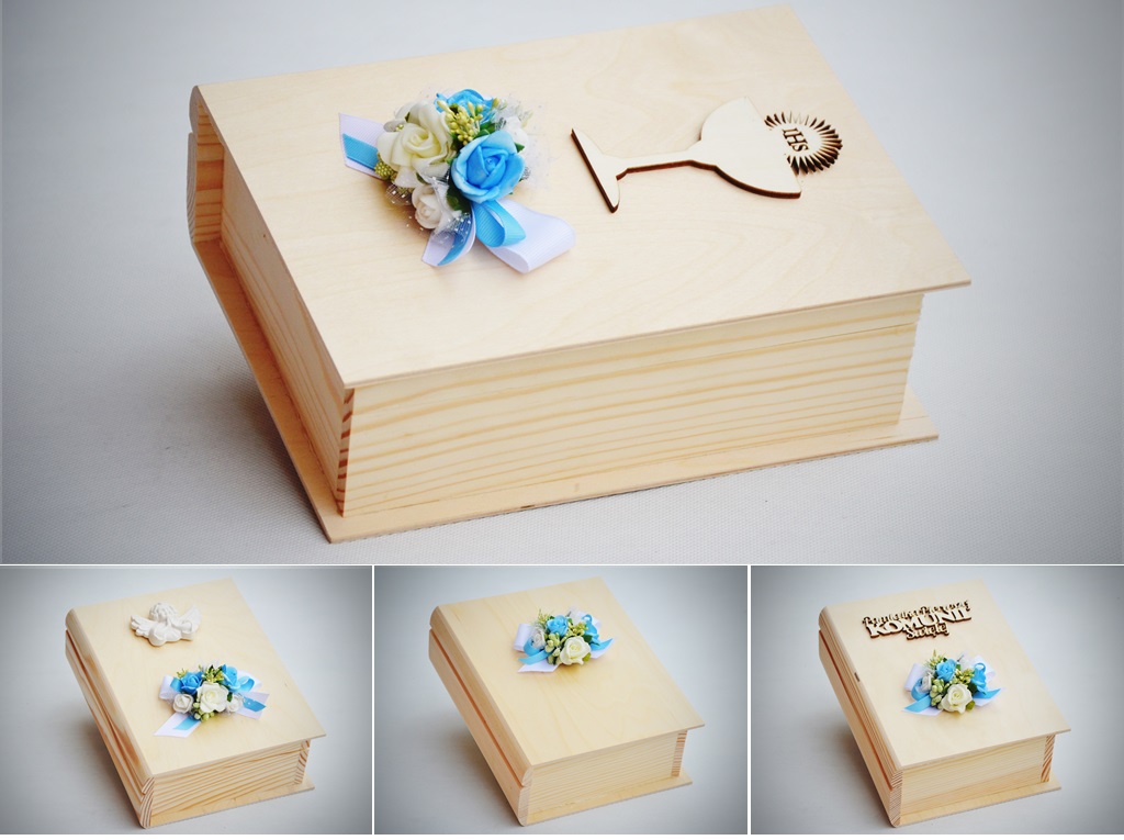 Оформление в нежных синих тонах с белой и зеленой фурнитурой. В набор входит синий Сувенир Первого Причастия, который дополняет красивый внешний вид шкатулки, которую можно использовать как место для хранения Библии, священной книги или четок.