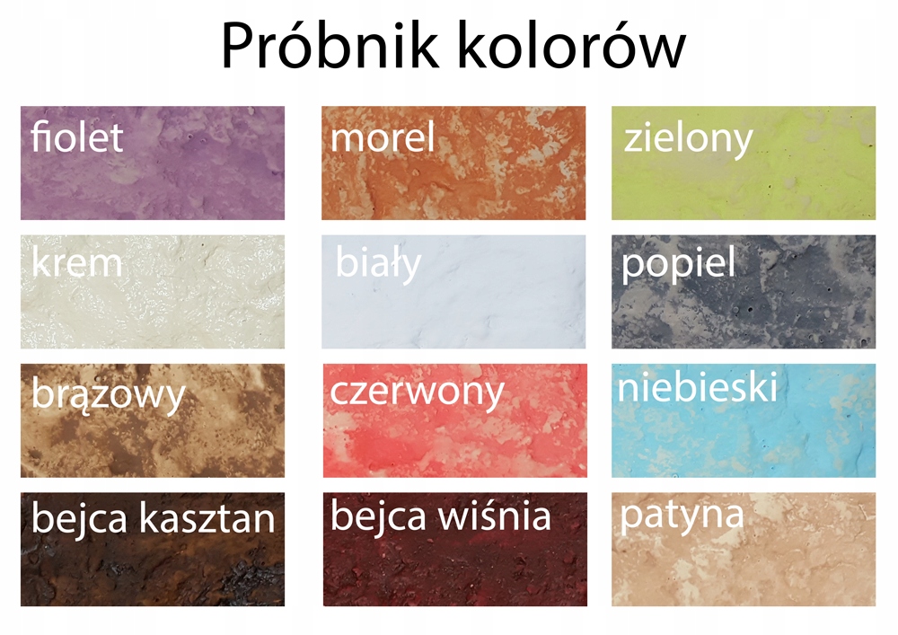 Фиолетовый, абрикосовый, зеленый, кремовый, белый, пепельный, коричневый, красный, синий, каштановая морилка, вишневая морилка, патина.
