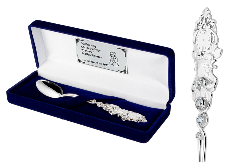 Серебряная ложка – прекрасный подарок на крещение или рождение как мальчику, так и девочке. Изготовлен полностью из серебра 925 пробы (проверено Пробирной палатой в Варшаве). В ложку встроены четыре циркона SWAROVSKI ELEMENTS. Мы бесплатно гравируем данные на ложке и посвящение на коробке.