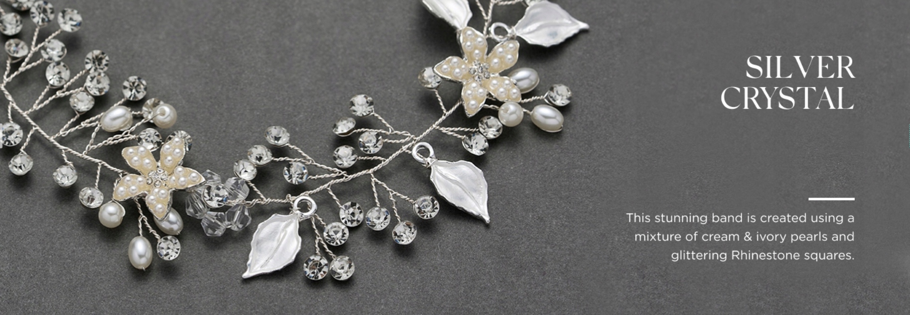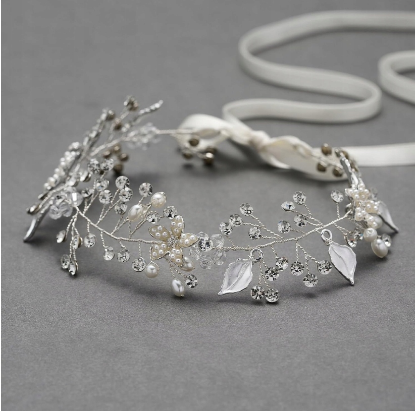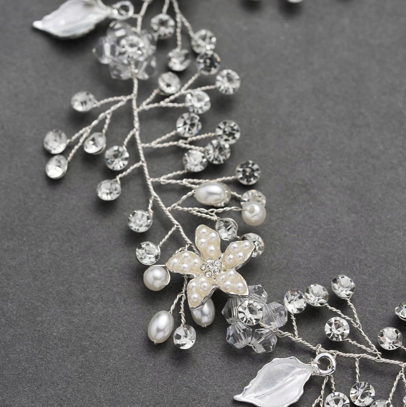 Смешание прозрачных кристаллов и акриловых жемчуга, украшенных 4 цветами с инкрустированными жемчужинами и эмалированными листьями. Свадебные аксессуары для волос, встроенные на эластичный металл, могут быть аккуратно сформированы, чтобы они идеально соответствовали вашим волосам.