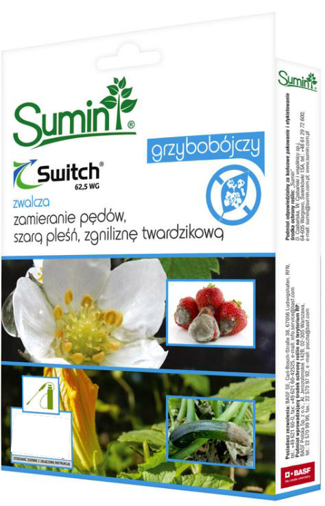 Switch 62,5 WG – фунгицид, концентрат в виде гранул для приготовления водной суспензии, глубинного и поверхностного действия, для профилактического и экстренного применения при борьбе с болезнями яблони, груши, айвы, черешни, вишни, сливы, абрикоса, персика, нектарина, клубники, малины, ежевики, черной смородины, красной смородины, белой смородины, черники, клюквы, виноградной, зеленой фасоль, фасоль для сбора свежих семян, фасоль для сухих семян, горох обыкновенный для свежих семян, горох сахарный, горох пищевой для сухих семян, фасоль белая, люпин желтый, люпин узколистный, лук репчатый, шалот, чеснок, яровой лук, зеленый лук, козлобородник, сельдерей, морковь, петрушка корневая, пастернак, свекла, хрен, репа, турнепс и те, которые выращиваются в земле, под навесом и в теплице, сельдерей, салатный цикорий, эндивий, свекла, шпинат, листовой салат и кочанный салат, травяные и декоративные растения, а также выращиваемые в закрытом грунте и в теплице для томатов, огурцов, баклажанов, кабачков, перца.