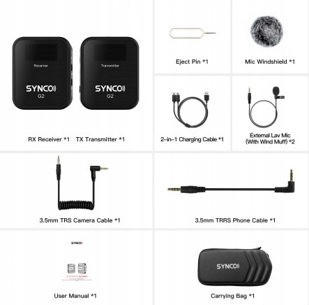SYNCO G2 A1 — универсальная беспроводная микрофонная система, работающая в диапазоне 2,4 ГГц, состоящая из 1 передатчика со встроенным микрофоном и 1 приемника, обеспечивающего обмен сигналами между устройствами, расположенными на расстоянии до 150 метров в свободном пространстве, литиевая батарея которой гарантирует до 8 часов работы на полной мощности. взимается плата. SYNCO G2 A1 идеально подходит для сценических выступлений, выступлений и видеоблогов, где один человек говорит в камеру.