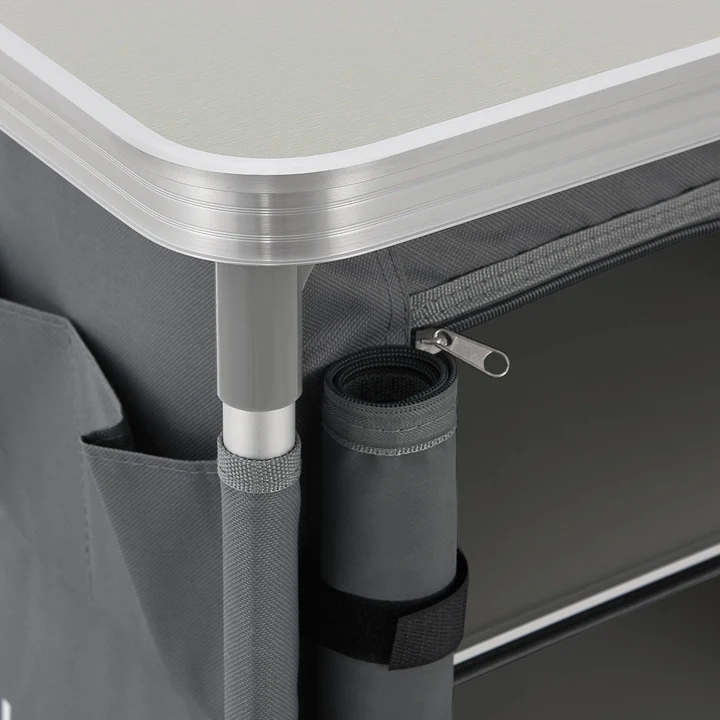В походном шкафу есть большая столешница для приготовления еды. Кроме того, он имеет многочисленные полки и боковые отделения для столовых приборов, посуды и многого другого. Полки закрываются на молнию.