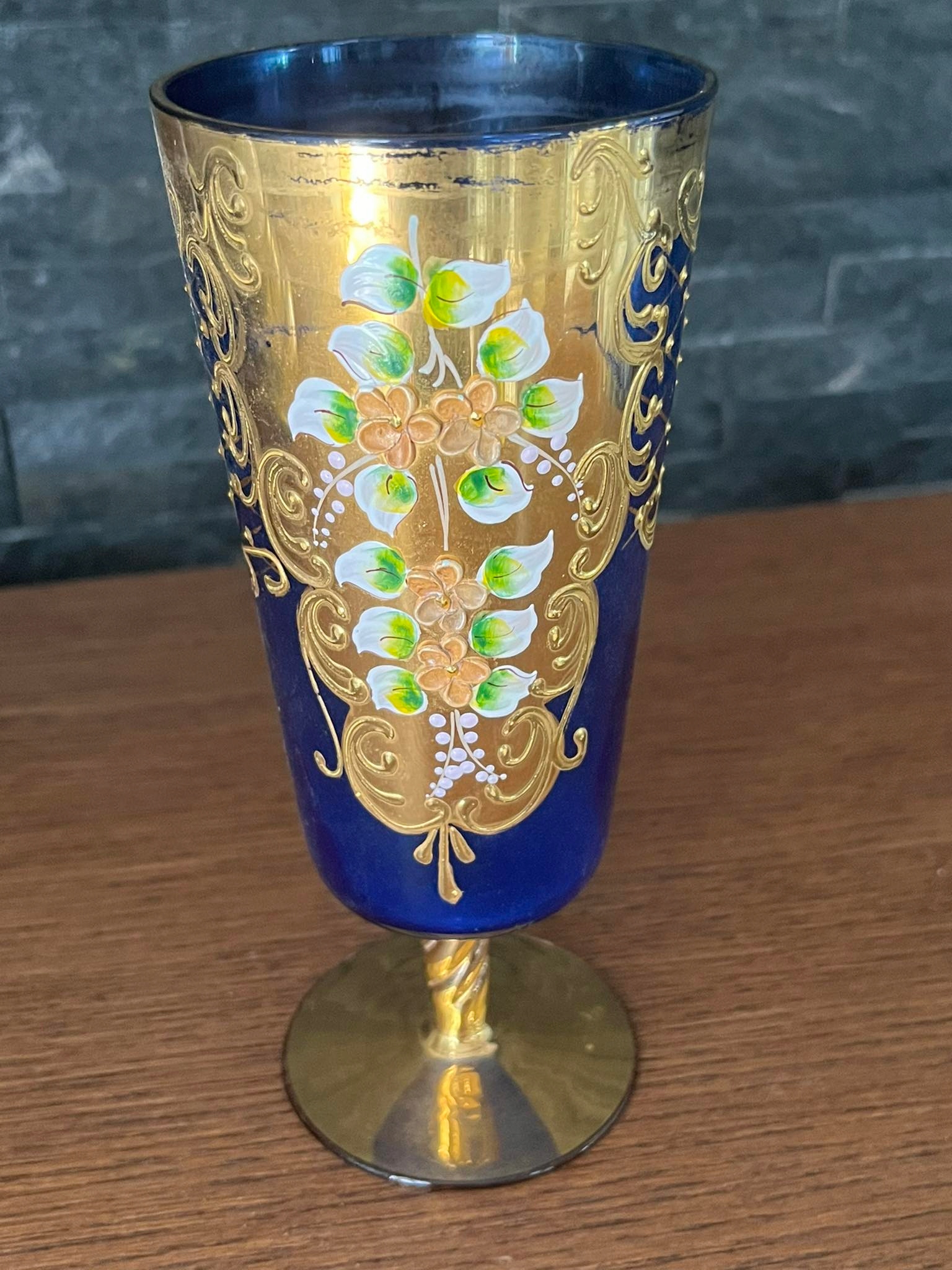 Szklany kielich wazon kobaltowe szkło malowane złotem