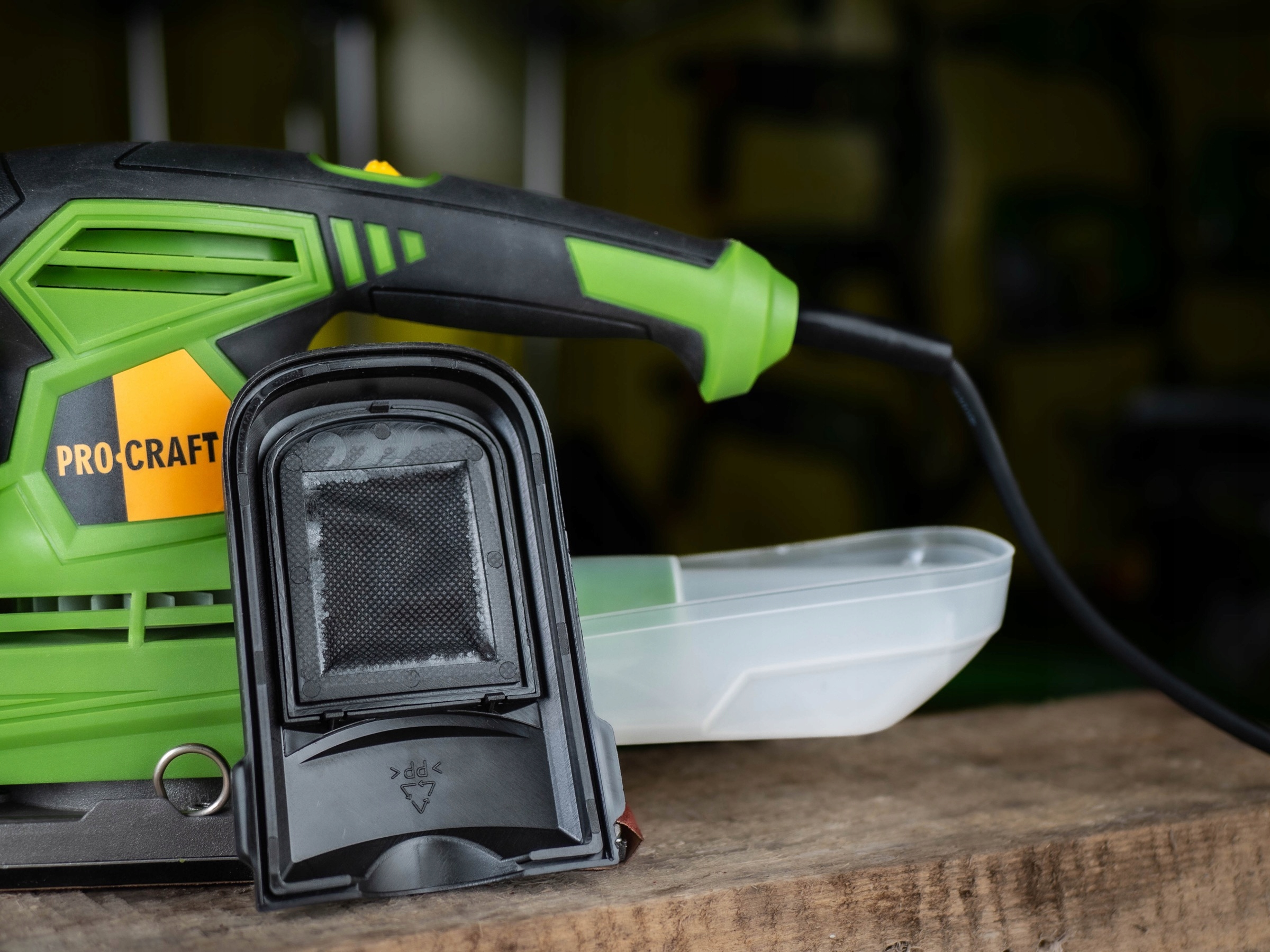 Пыль собирается в специальный контейнер с фильтром, предотвращающим вылет пыли. Вместо использования контейнера к измельчителю также можно подключить пылесос, что еще больше повышает эффективность всасывания и сбора пыли.
