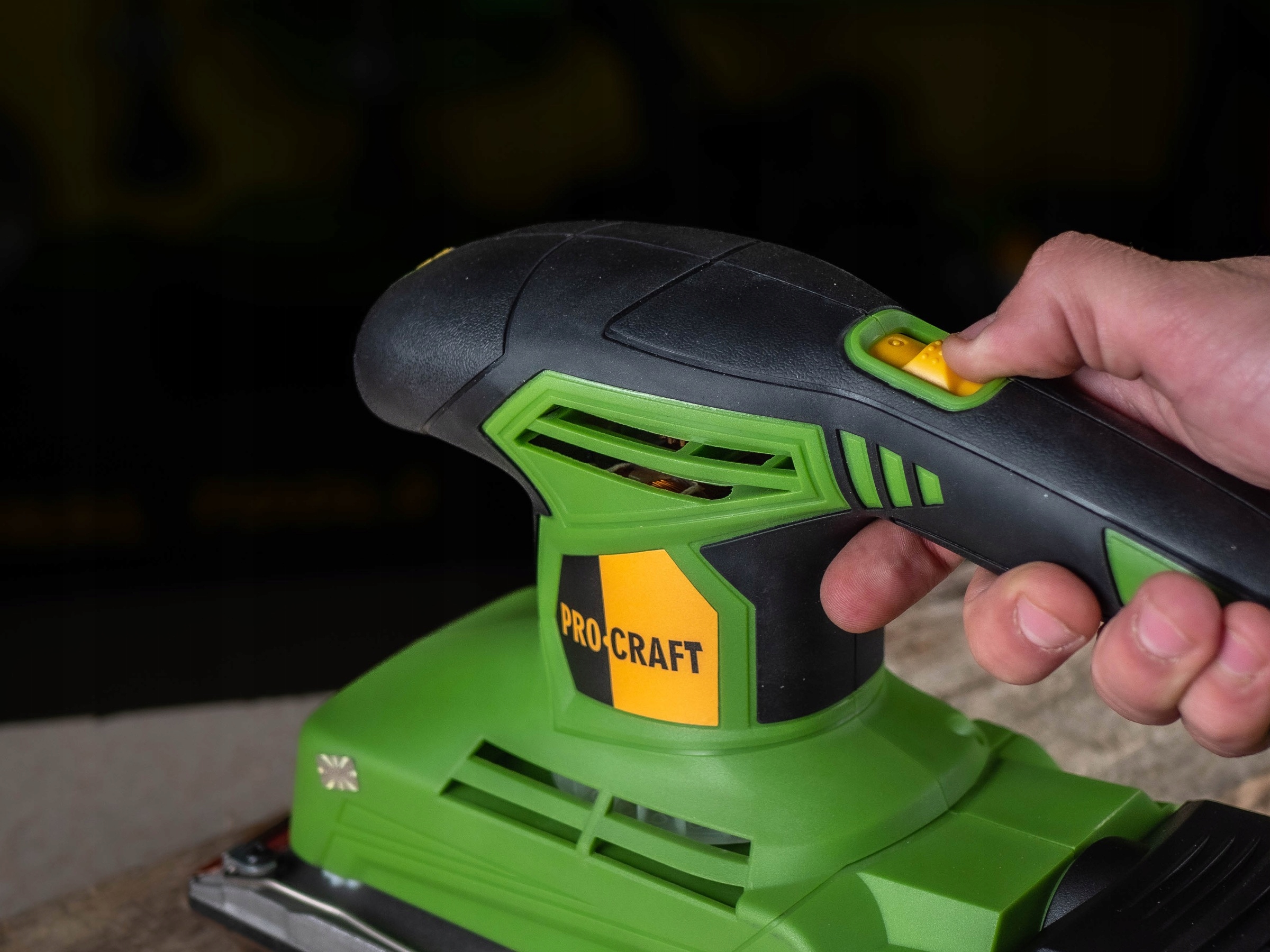 Корпус PV300 спроектирован таким образом, чтобы им можно было удобно управлять одной рукой. Ползун переключателя расположен сразу под указательным пальцем, слегка утоплен в корпус, поэтому не мешает работе и защищает от случайного включения или выключения во время шлифовки. Все вентиляционные отверстия расположены таким образом, чтобы их нельзя было случайно заблокировать рукой при нормальной работе.