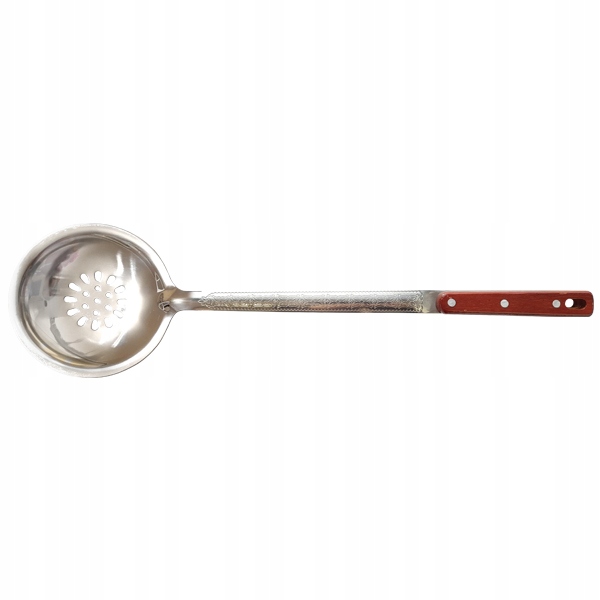 Шумовка с декоративным орнаментом и деревянной ручкой будет прекрасно смотреться на вашей кухне. Это незаменимый инструмент для каждого любителя кухни, сочетающий в себе функциональность и эстетичный дизайн.