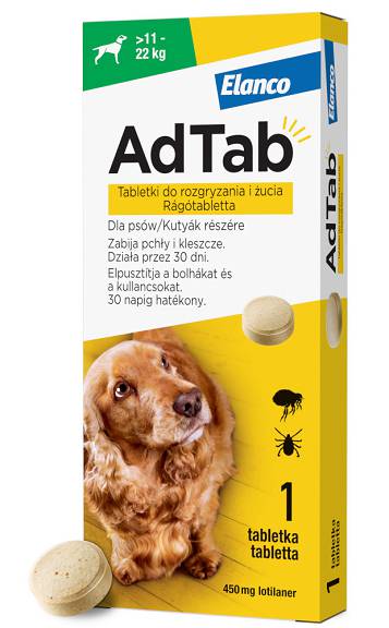 Применение по назначению: AdTab™ 450 мг предназначен для собак старше 8 недель и весом от 11 до 22 кг.