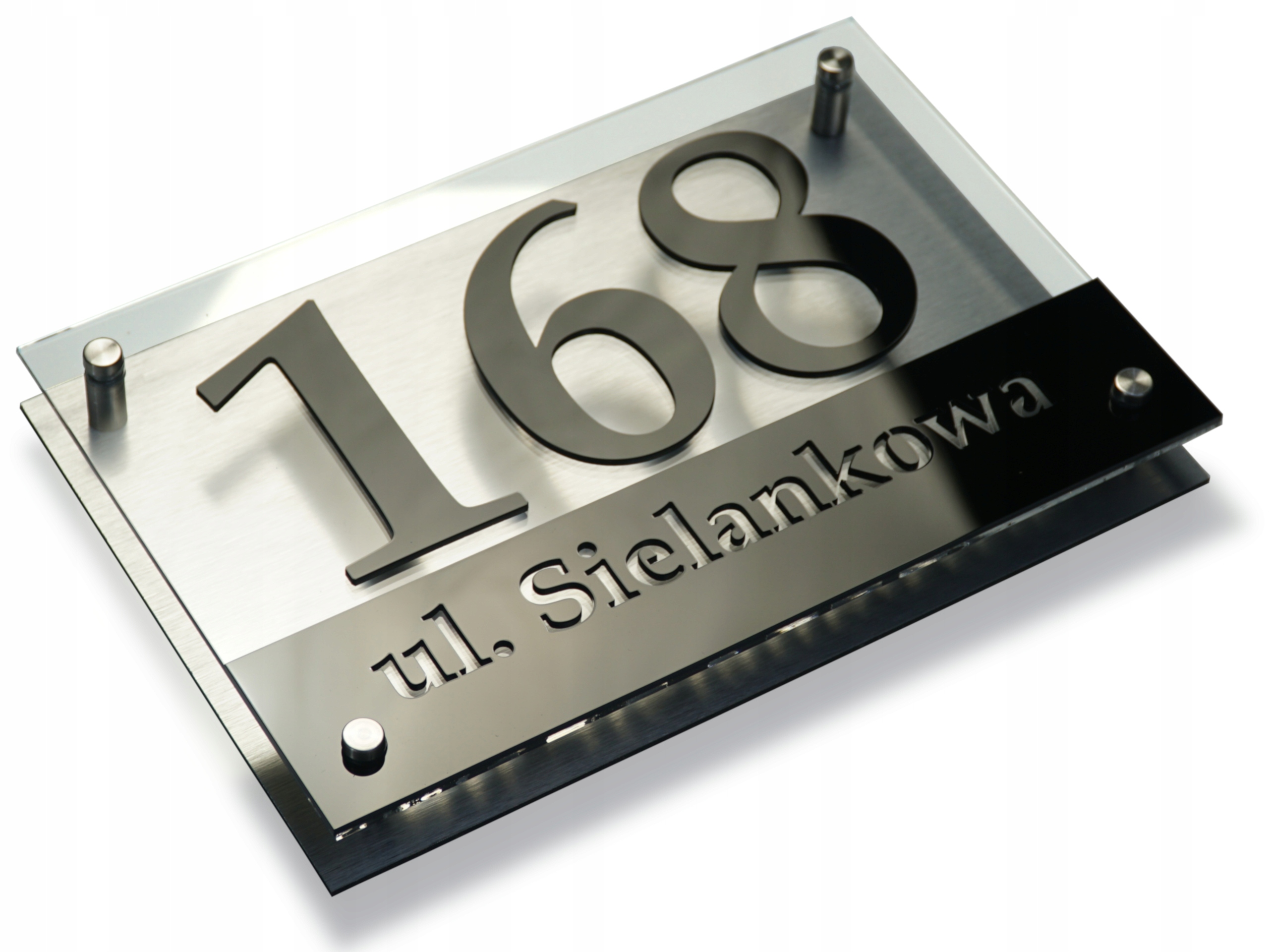Предмет продажи – именная адресная табличка. Изделие изготовлено из акрилового стекла высочайшего качества толщиной 3 мм, что обеспечивает высокий глянец и устойчивость к погодным условиям. В нижней части мы использовали дибонд, покрытый матовым алюминием. Верхний слой состоит из бесцветного оргстекла и надписи, также выполненной из оргстекла. Изготовленная таким образом тарелка дает эффект 3D.
