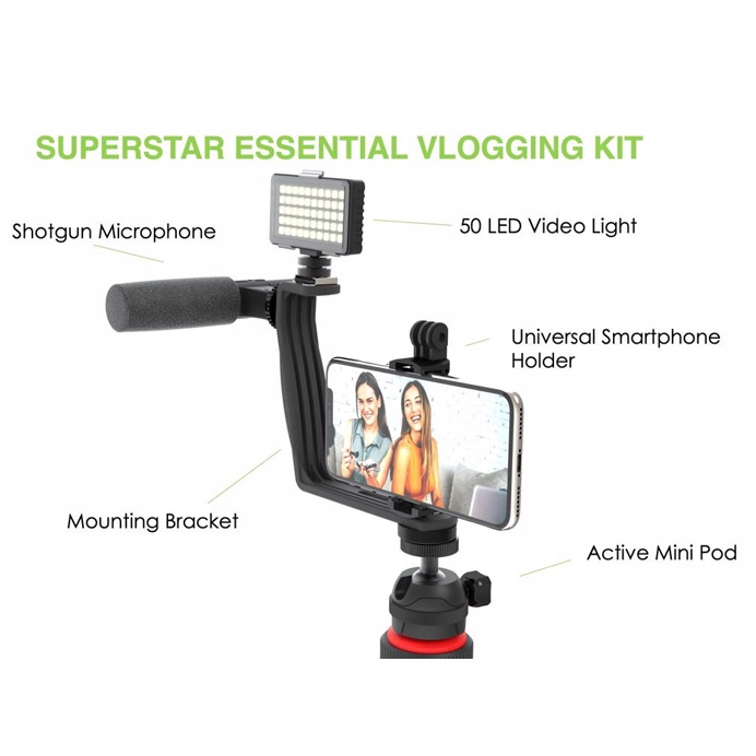 В комплект для видеоблогов Superstar Essential входит компактная видеолампа на 50 светодиодов, отвечающая вашим потребностям в фото- и видеосъемке. Микрофон-пушка с временем записи до 800 часов, поэтому вам никогда не придется беспокоиться о том, что звук закончится во время съемки. Многофункциональный штатив со съемным встроенным беспроводным пультом дистанционного управления и держателем для смартфона/спортивной камеры с кронштейном, на котором крепятся все элементы, входящие в этот набор. Благодаря этому вы можете подключить телефон или камеру и создать полный набор для записи видеоблогов.