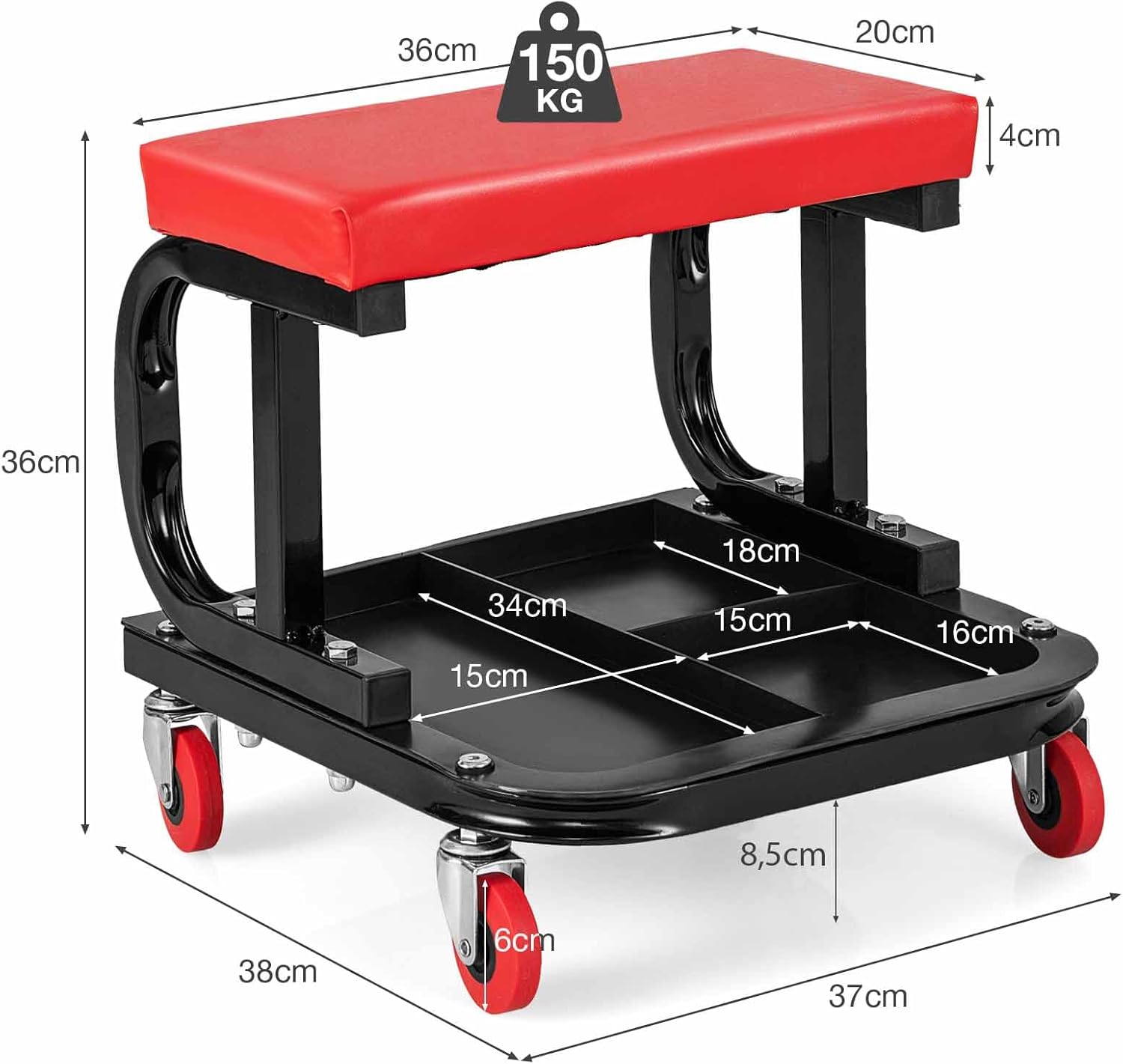 Мягкое, мягкое сиденье, покрытое легко чистящимся материалом, гарантирует комфорт даже при длительной работе. Под сиденьем находится металлическая полка с отделениями, идеально подходящая для хранения инструментов, шурупов или аксессуаров, что повышает эффективность и порядок во время работы.