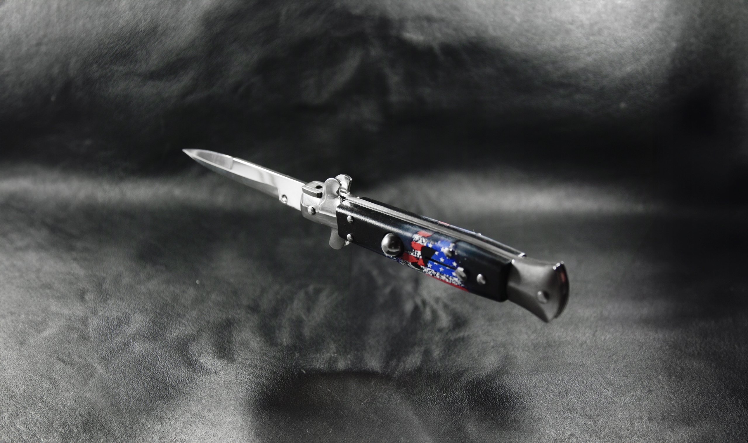 - Черная рукоятка этого уникального итальянского выкидного ножа украшена потрясающим рисунком, который обязательно привлечет внимание. В центре расположен череп с американского флага, что придает ножу неповторимый и определенно характерный вид