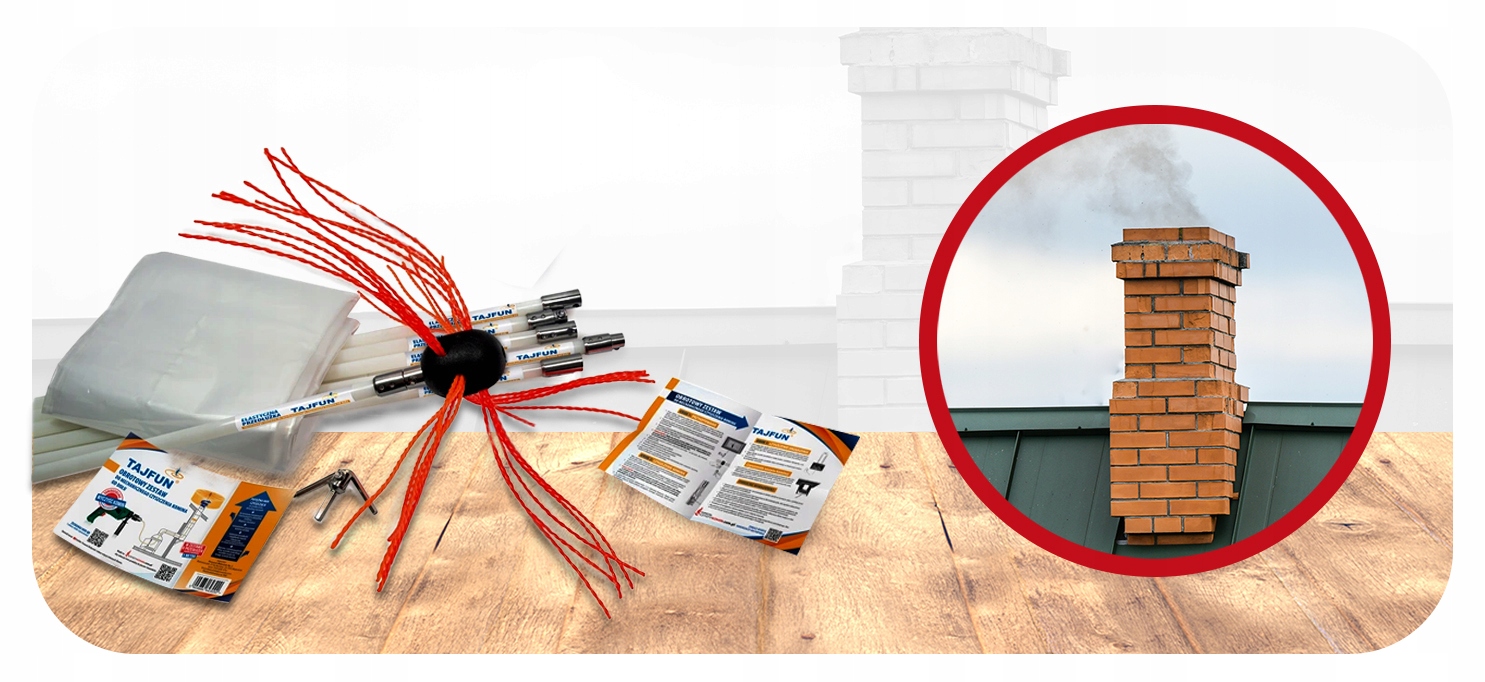 Набор «Тайфун» предназначен для удаления легких и умеренных отложений сажи и креозота в кирпичных и керамических дымоходах любого диаметра и формы.