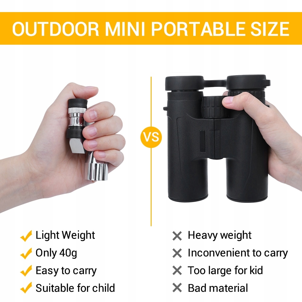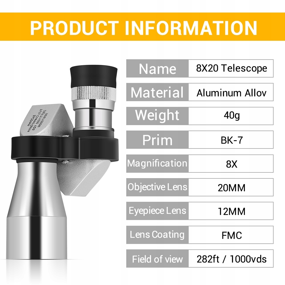 <р>1. Компактный бинокль с мощным 8-кратным увеличением и объективом 20 мм. <р>2. Карманный монокуляр 8х20 катадиоптрической конструкции — мощный инструмент для альпинизма, пешего туризма. Это лучший телескоп с большим увеличением для взрослых и детей. <р>3. Длина 2,7 дюйма, ширина 1,1 дюйма. Увеличение большой линзы — 8 раз. Объектив изготовлен из высококачественного стекла БК-7. <р>4. Водонепроницаемый, что может продлить срок службы вашего телескопа. Легко использовать в сложных условиях. <р>5. Точная регулировка фокуса, конструкция шкива, более точная регулировка. Монокулярный телескоп закрывает глаза как для близорукости, так и для неблизорукости. <р>6. Этот монокуляр имеет большое поле зрения и идеально подходит для просмотра спортивных состязаний, путешествий, наблюдения за птицами, осмотра достопримечательностей и многого другого.Спецификация: