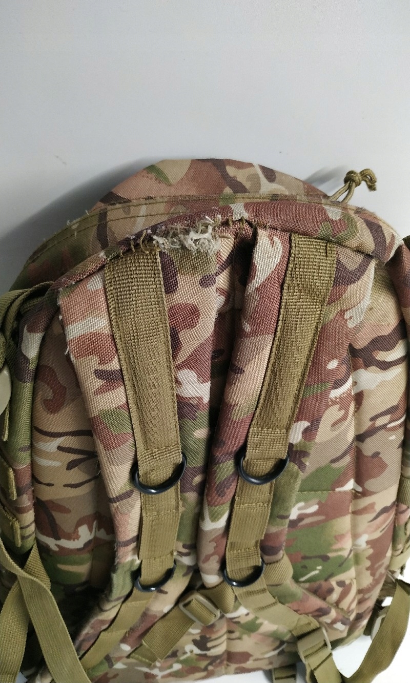 - Имеется надрыв возле лямок, отсутствует одна часть крепления погона, задняя лямка в нижней части рюкзака отсутствует, имеются незначительные катышки на материале и грязь внутри рюкзака.