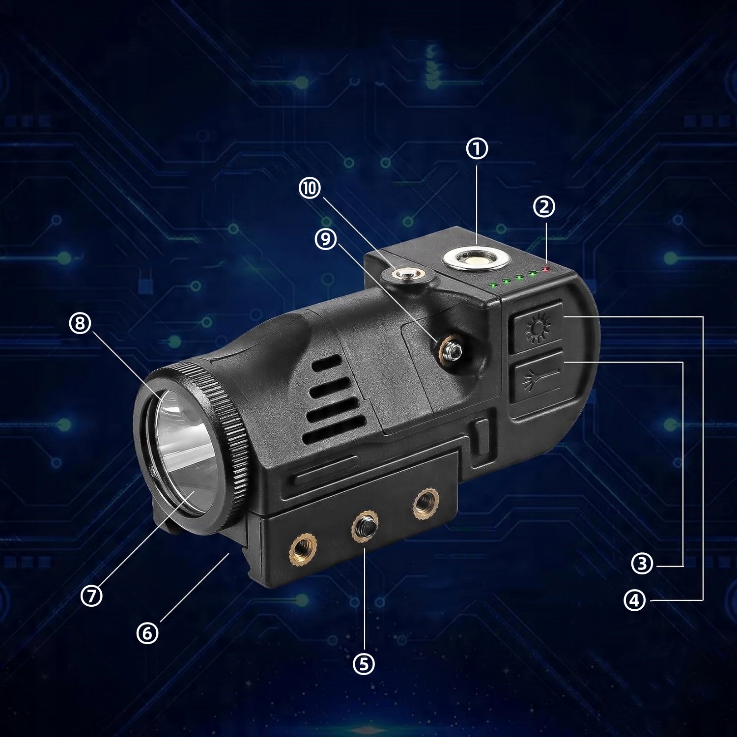 Высокое яркость освещения: благодаря яркости 500 лм, оно может обеспечить чистый и яркий свет в темных местах, отвечающих различным требованиям к освещению, таким как приключения на открытом воздухе, ночные патрули, сцены стрельбы и т. Д., Предоставляя пользователям хорошую видимость. Это позволяет вам точно указывать отдаленные цели. Может быстро и точно действовать в качестве руководства в сложной местности в груди природы или отмечать цели во время стрельбы и военных операций.