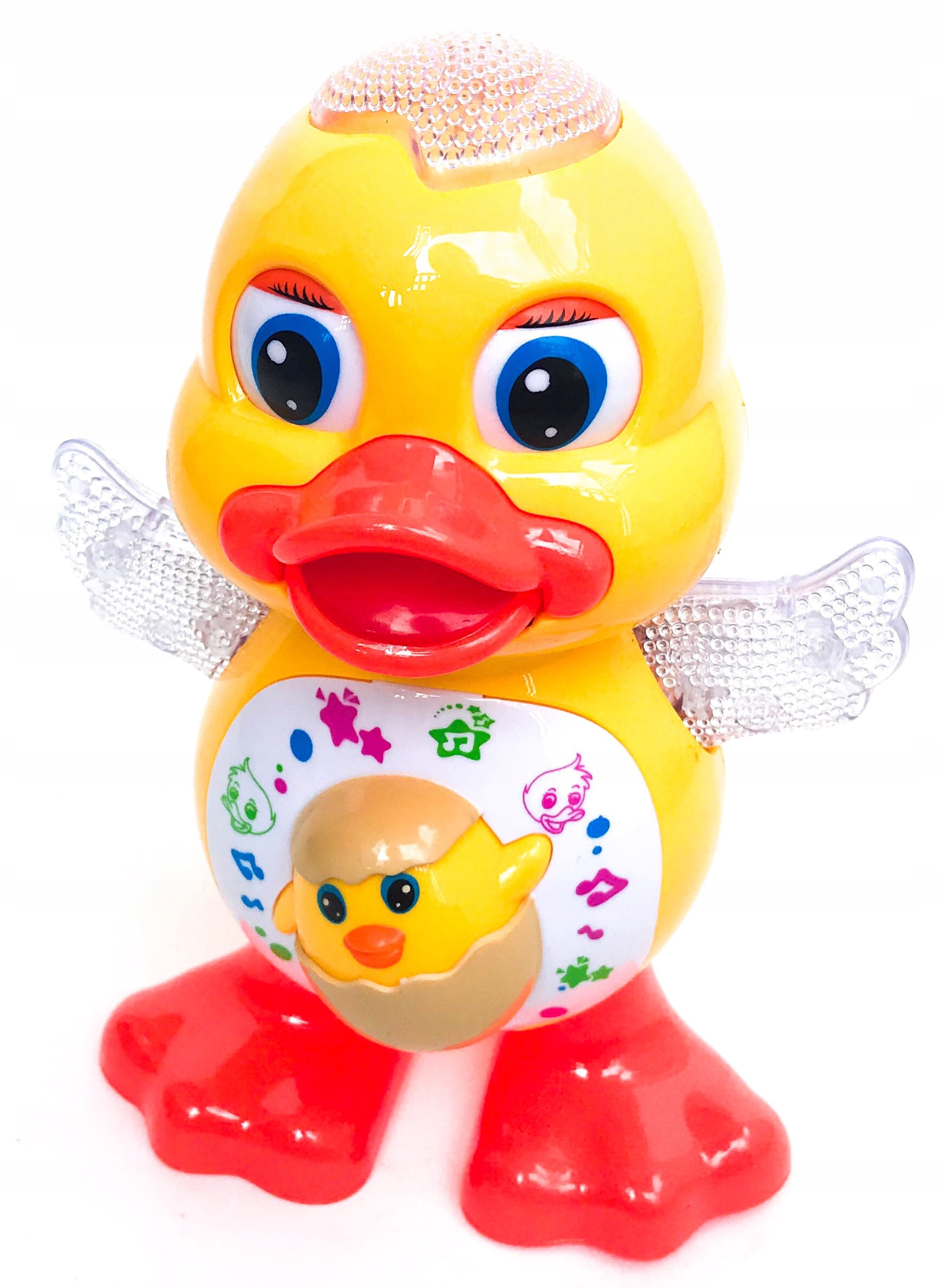 Утка танцует и ходит в ритме веселой песни. Мигающие огни и музыка соответствуют танцевальным движениям.