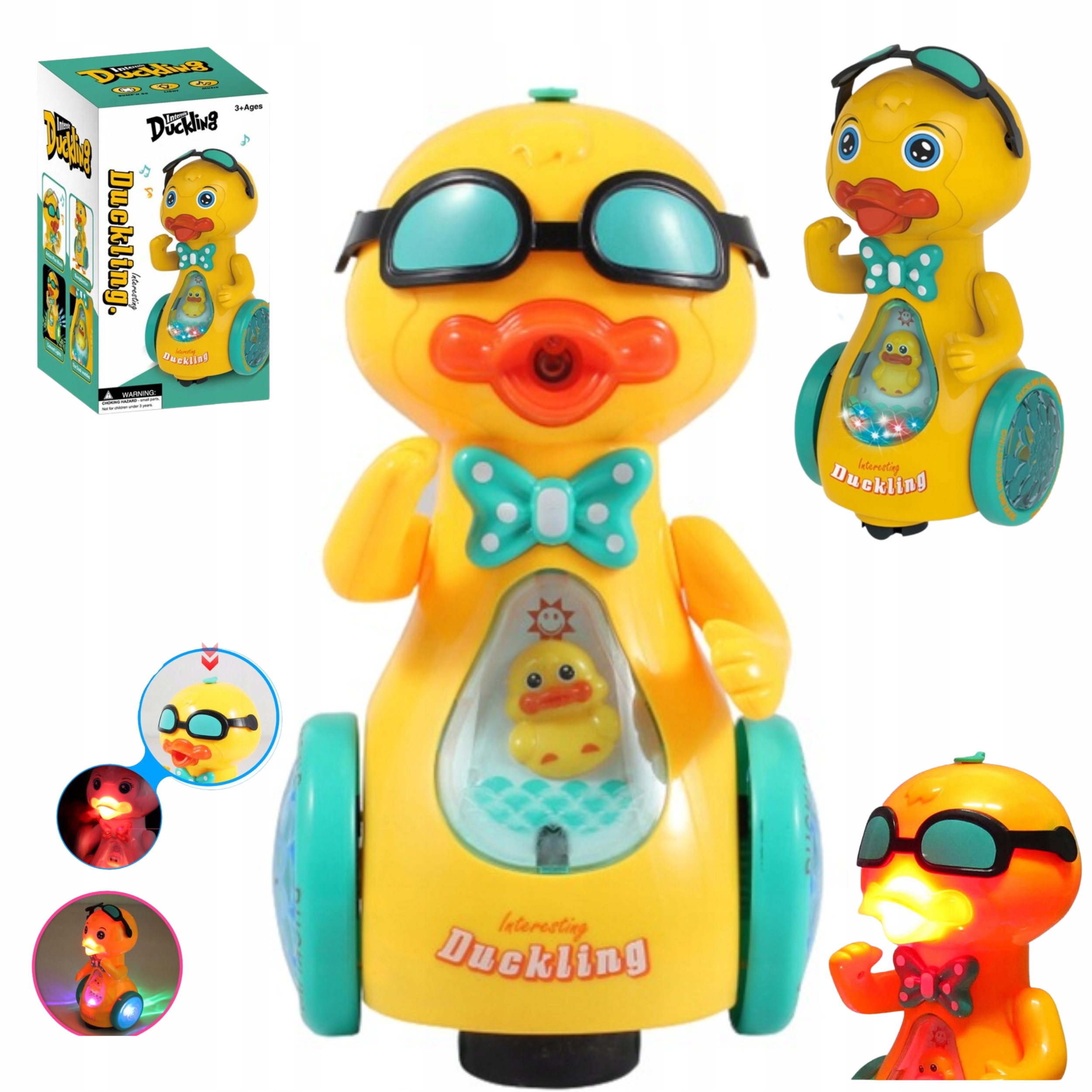 Эта утка оснащена очками, которые поднимаются и опускаются синхронно с музыкой. Ее руки танцуют вместе с музыкой, и утенок в брюхе игрушки тоже движется в гармонии с мелодией.