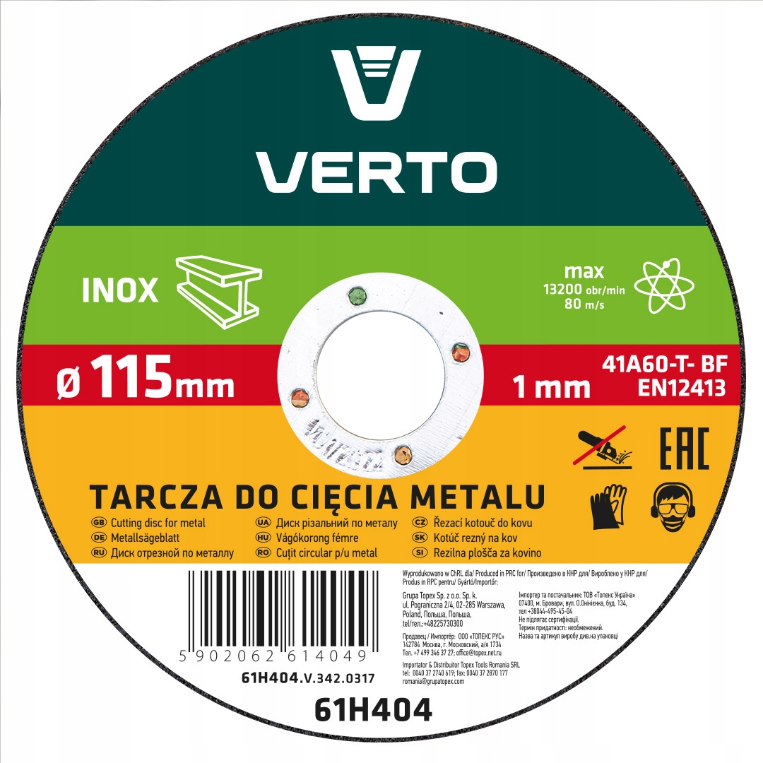 TARCZA DO CIĘCIA METALU INOX 115x1.0x22.2 mm VERTO