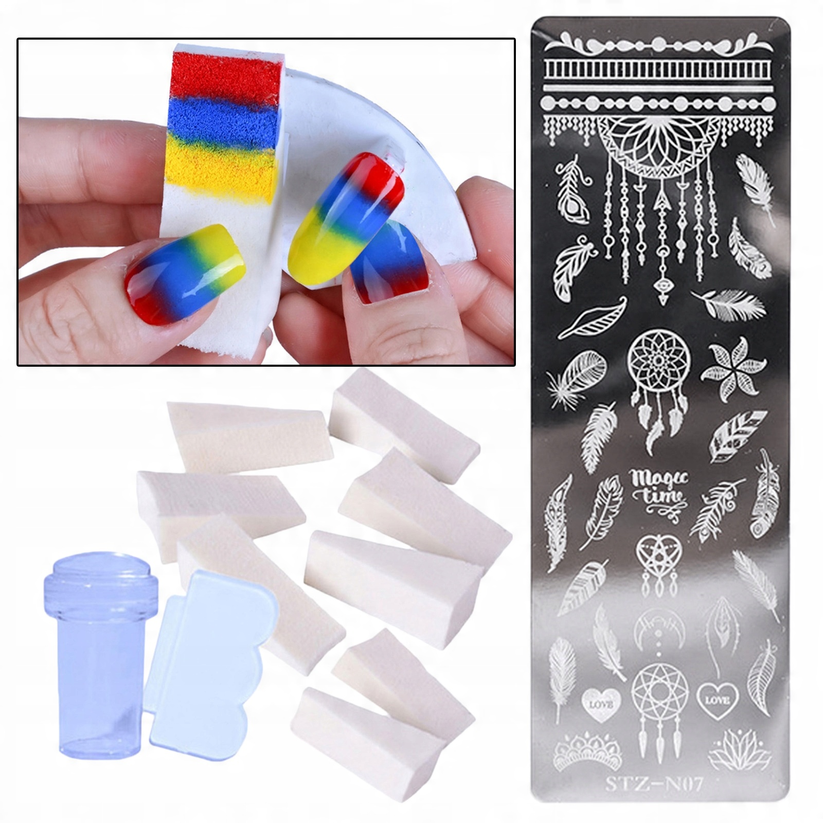 В этот набор для стемпинга ногтей входят пластины, штамп, скребки и губки