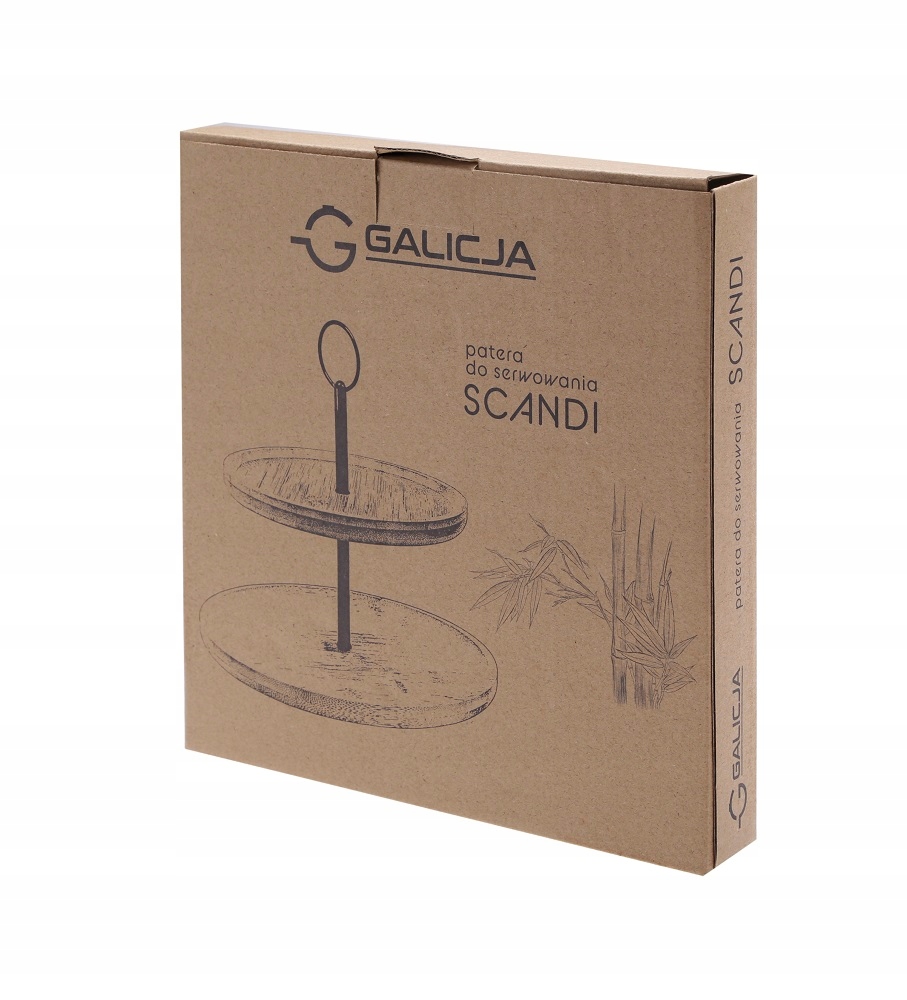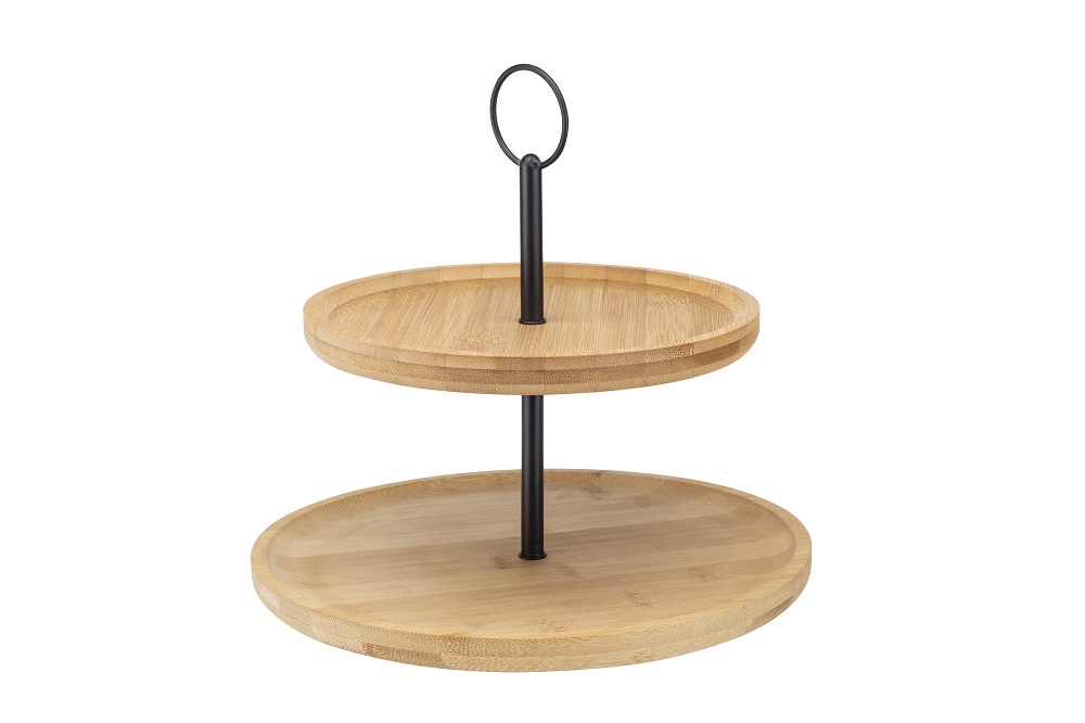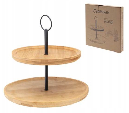 Двухъярусная плита SCANDI интересна, декоративна и согревает интерьер кухни! Представленная тарелка является одним из незаменимых элементов оборудования кухонного стола. Он изготовлен из бамбукового дерева натурального цвета и имеет форму двух столешниц. Чтобы диск принял правильную форму, его ключевым элементом является каркас, изготовленный из высококачественной стали с черным порошковым покрытием. Самым большим преимуществом тарелки является ее компактность - она складывается до небольших размеров, но в разложенном виде на ней можно разместить множество тортов и фруктов.