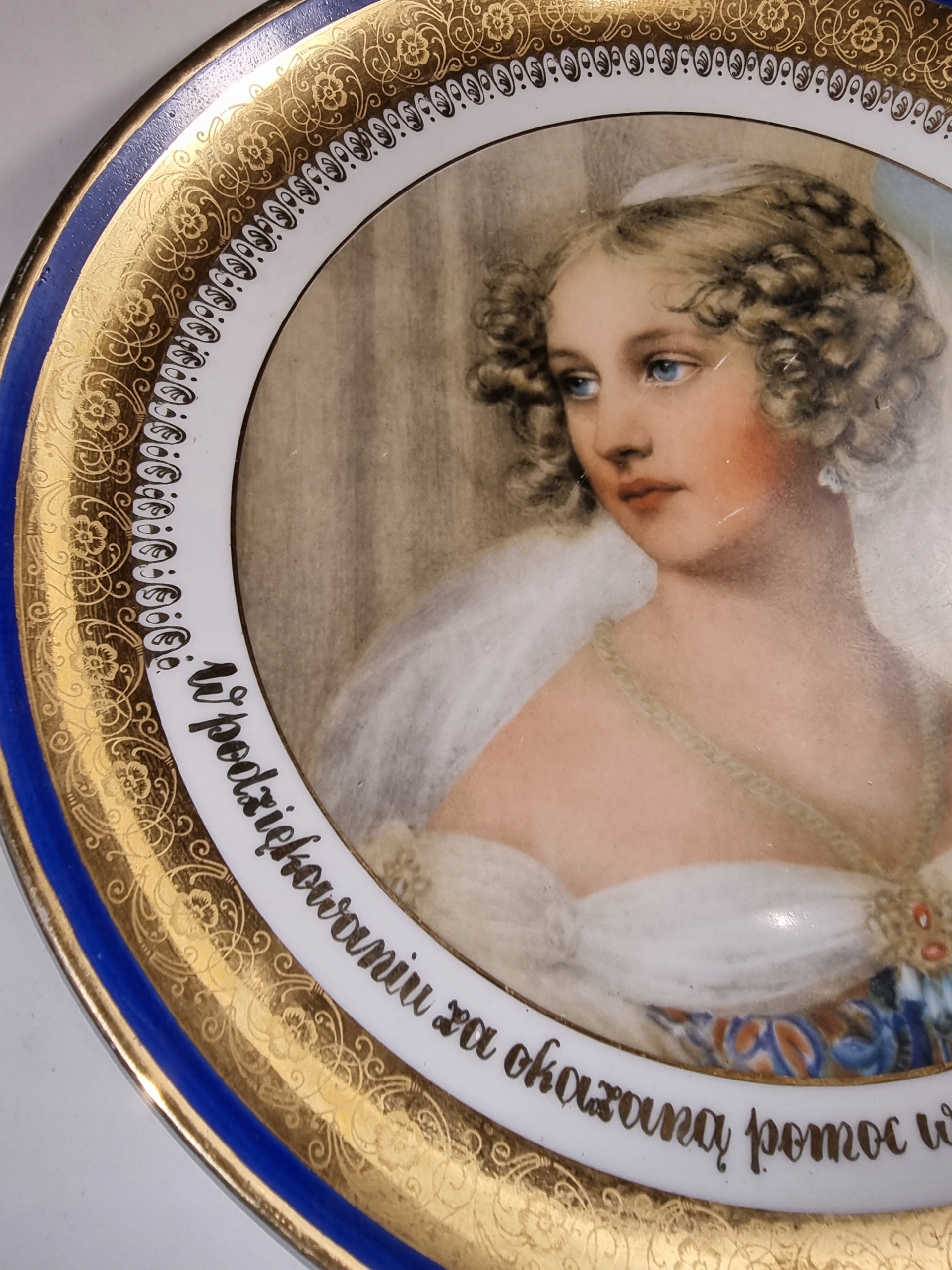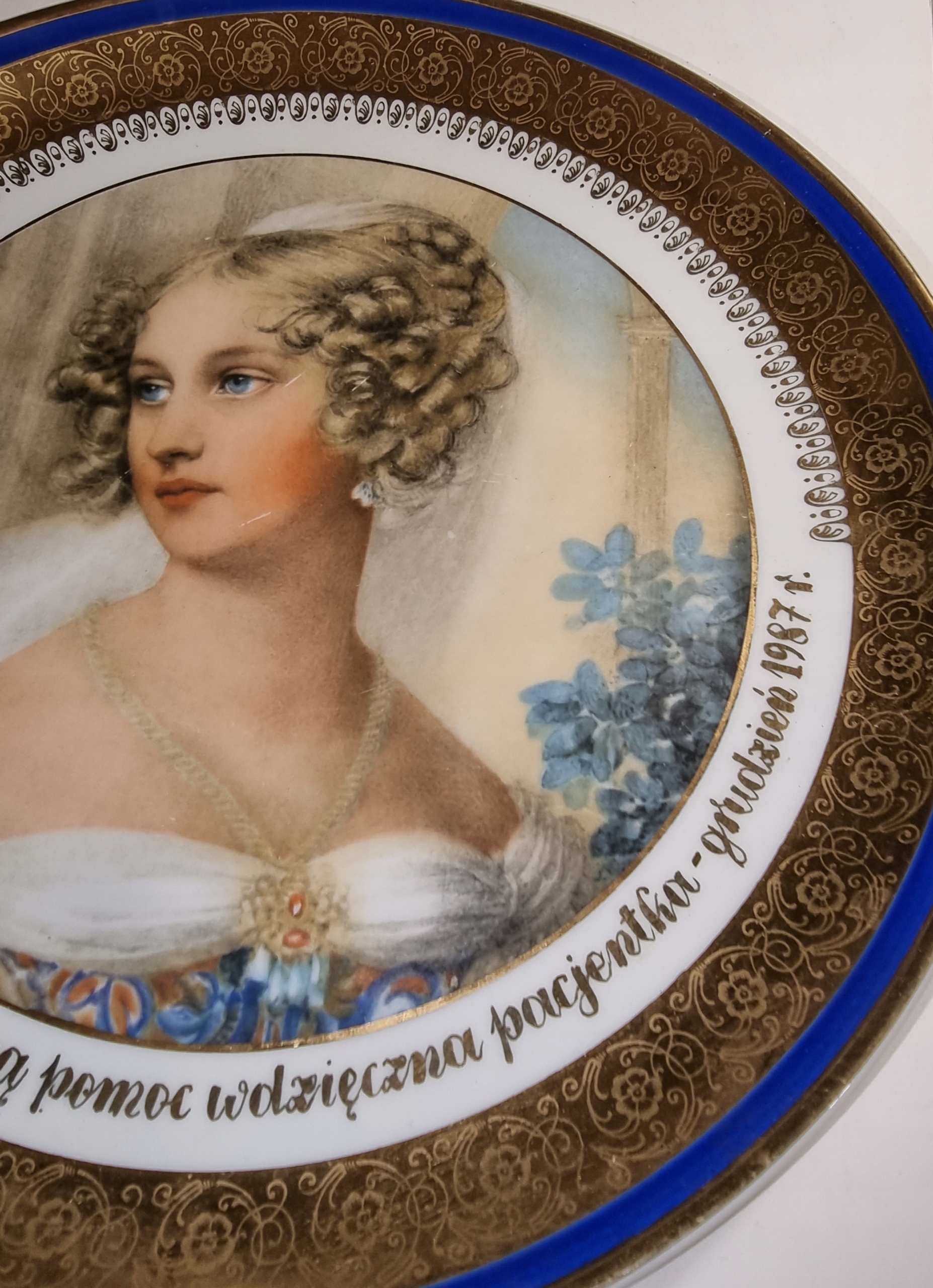 Декоративная фарфоровая тарелка, украшенная позолотой и благодарственным текстом 1987 года.