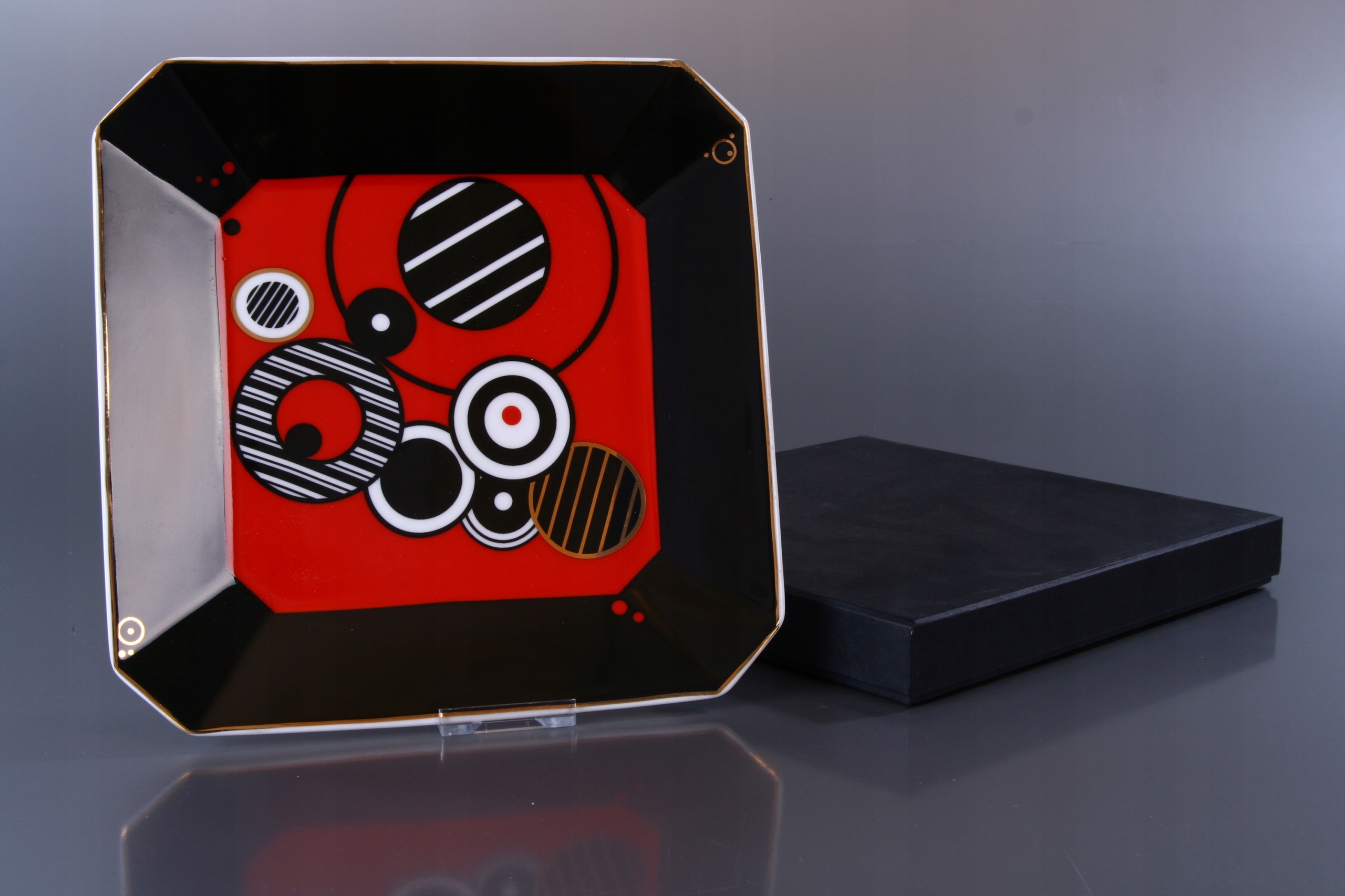 Большие тарелки, каждая упакована в стильную черную подарочную коробку. Тарелки из высококачественного белого фарфора с современным декором. Использованы цвета: черный, красный и белый, слегка подчеркнутые золотом.