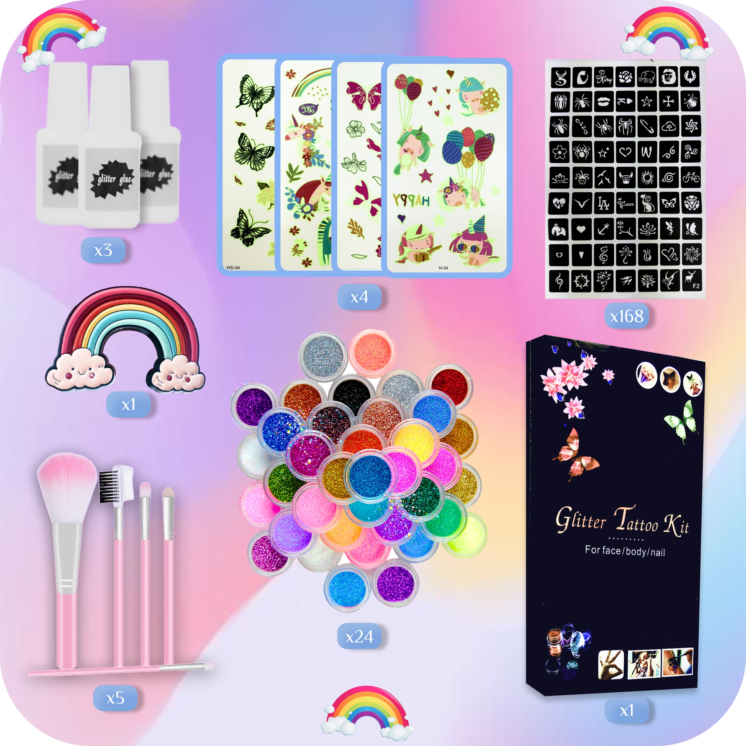 - 24 банки с блеском : 24 x красочный блеск , которые добавляют великолепие и магию к каждой татуировке. Кисти : разные размеры кистей для удобного и точного нанесения блеска.
