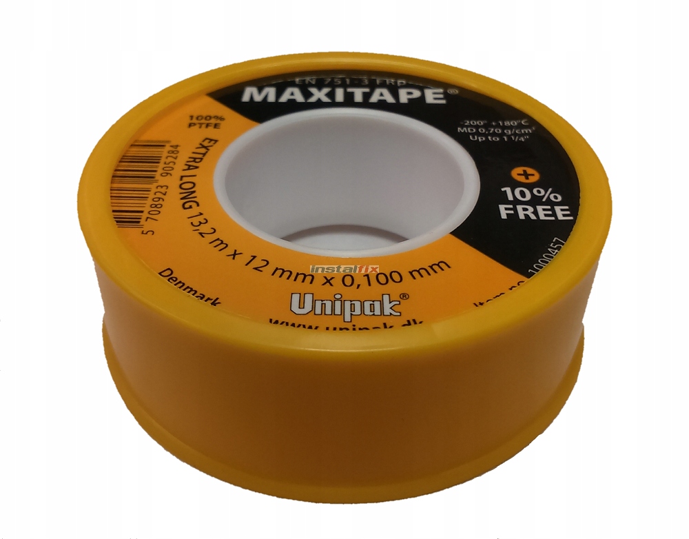 MAXITAPE (12 м x 12 мм x 0,1 мм). МД (плотность: 0,7 г/см3). Лента предназначена для герметизации резьбовых соединений в газопроводах, системах питьевого водоснабжения, горячего водоснабжения, центрального отопления, пара и подобных установках. Рекомендуется использовать в установках диаметром до 1 1/4", рабочая температура от -200 до +180°С и давление до 30 бар.