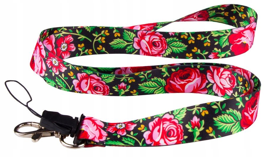 Черный широкий шнурок для телефона/брелока с горским цветочным узором.