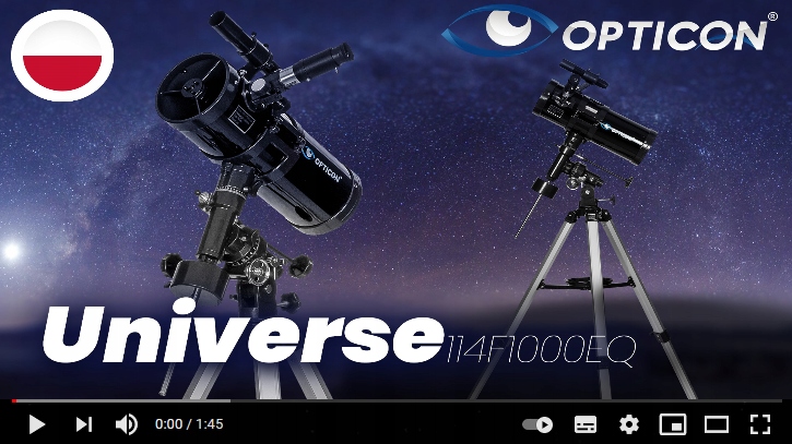 Opticon Universe — профессиональный астрономический телескоп для домашнего использования, рекомендуемый как начинающим, так и опытным наблюдателям ночного неба. Прибор оснащен главным зеркалом с апертурой 114 мм и фокусным расстоянием 1000 мм. Труба телескопа изготовлена из прочного сплава и установлена на полноразмерном алюминиевом штативе с экваториальной головкой EQ-III. Этот тип насадки позволяет легко и точно находить объекты на небе по координатам, считанным из звездного атласа. Отслеживание осуществляется с помощью удобных микродвижений. Данная модель также оснащена искателем (прицелом).