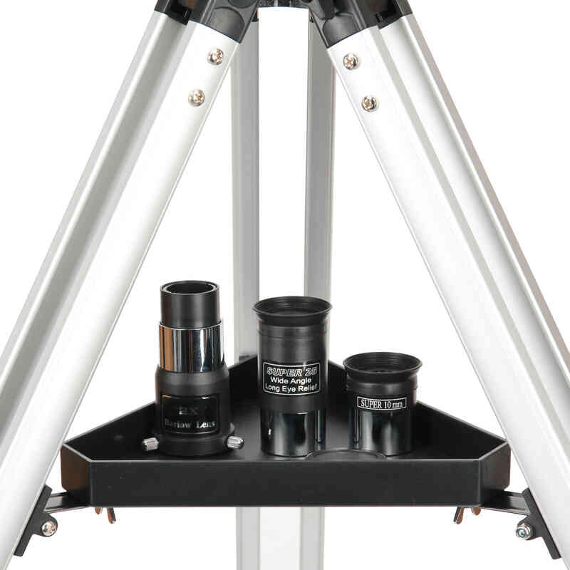 Светолинзовый телескоп с апертурой 70 мм и фокусным расстоянием 900 мм. Этот телескоп подвешен на экваториальной монтировке EQ1, предназначенной для астрономических наблюдений. Экваториальные монтировки позволяют следить за наблюдаемым объектом при его движении по небу. Кроме того, узел имеет микродвижения, благодаря чему можно точно навести телескоп на объект. Этот телескоп хорошо подходит для наблюдения Луны, позволяет рассмотреть основные детали планет Солнечной системы, а после использования дополнительного солнечного фильтра позволяет наблюдать солнечные пятна.