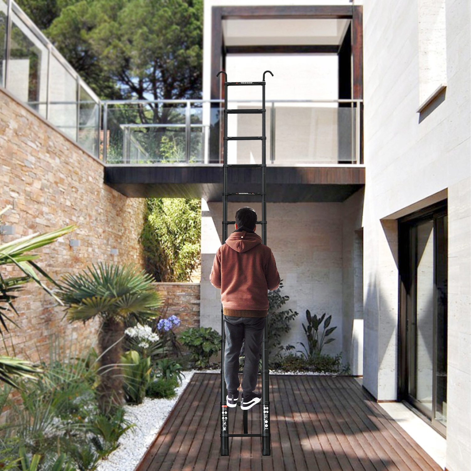 ✅ Надежность и долговечность: Максимальная грузоподъемность этой лестницы составляет 150 кг (330 фунтов), что обеспечивает ее безопасное использование. Нескользящие резиновые ножки и съемные крючки делают телескопическую лестницу более устойчивой, обеспечивая максимальную безопасность. Его можно переносить одной рукой за ручку. (Примечание: Лестничный крюк не следует вешать на трубы диаметром более 7 см.)