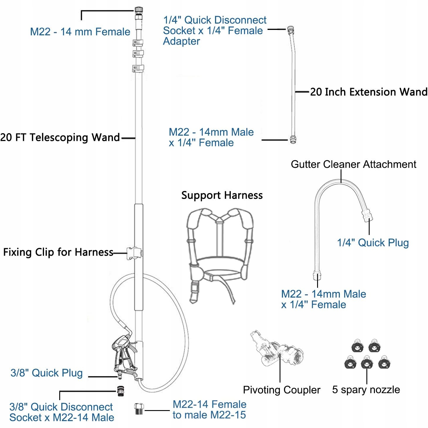 ✅ в наборе: Содрусные сопла разных углов (0 °, 15 °, 25 °, 40 °) и для введения химии, а также ремень скрепления для большего комфорта.