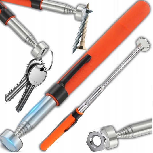 Телескопическая стрела длиной 72 см с магнитом для подъема металлических предметов, таких как винты, гайки, шайбы и т.д. выдерживает нагрузку в 3 кг.