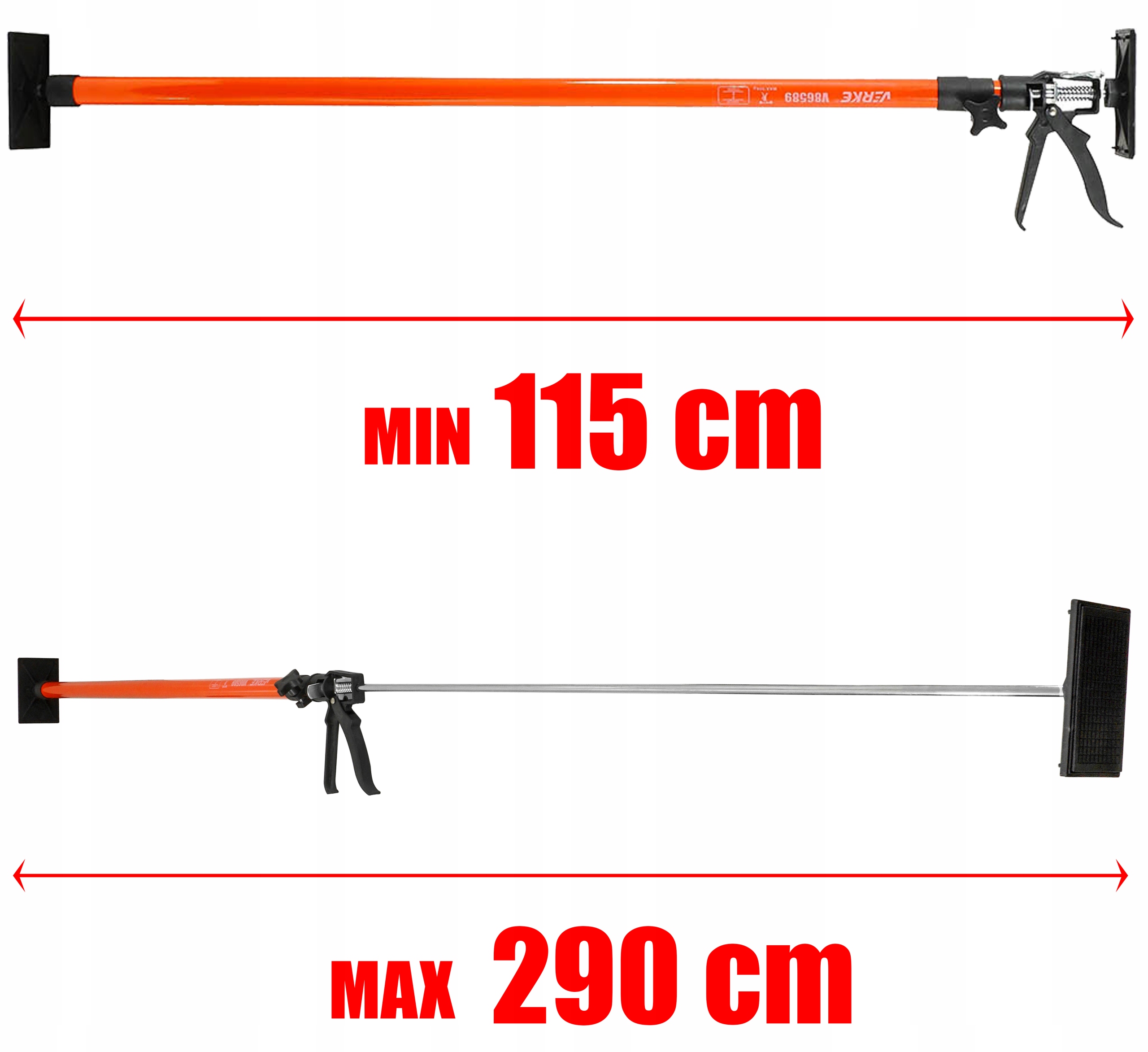 Телескопические опоры предназначены для временного крепления строительных и конструктивных элементов. Чаще всего используется для крепления гипсокартона или других плит во время монтажа и постоянного привинчивания, например, на потолках. Регулировка длины осуществляется в два этапа путем первоначального снятия с корпуса и фиксации пружинными штифтами, а также точного выдвижения и регулировки опоры с помощью кнопки рычага. Максимальная безопасная нагрузка – 30 кг. Рабочий диапазон 115-290см.