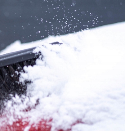 Щетка с мягкой щетиной бережно собирает снег, не царапая поверхность автомобиля.